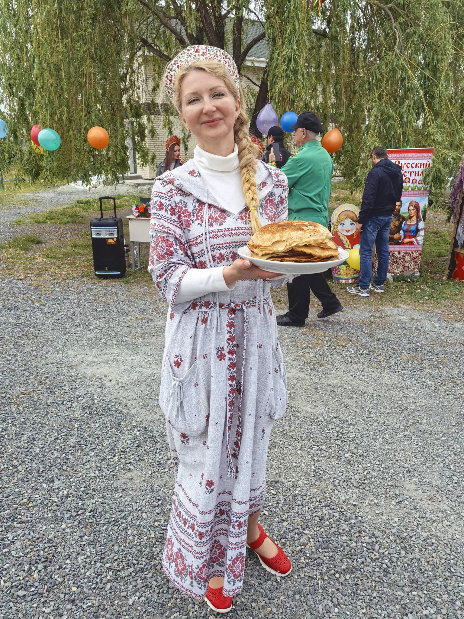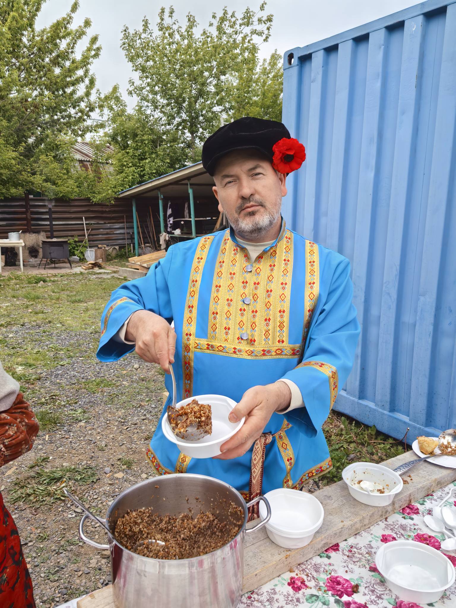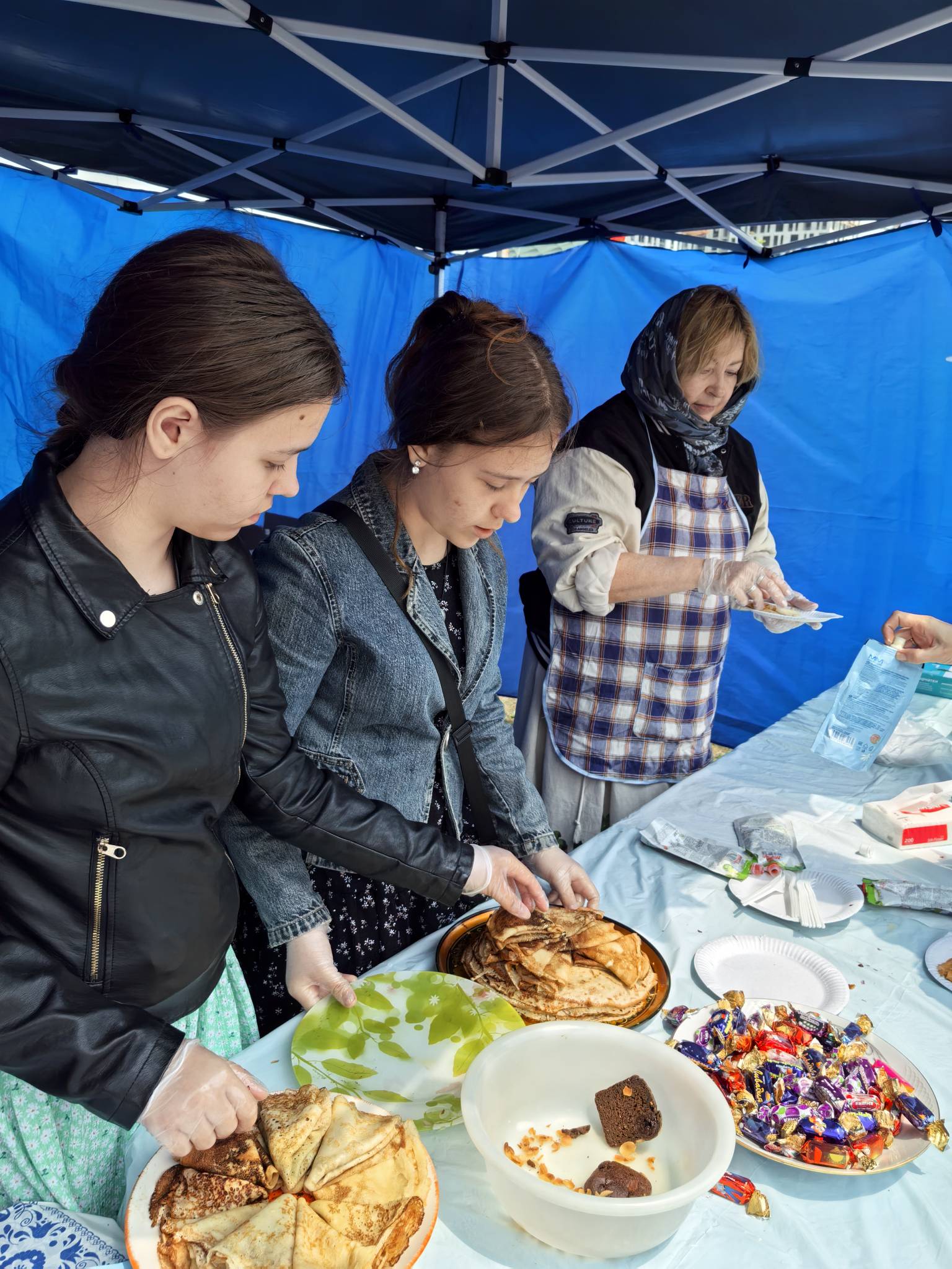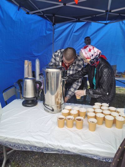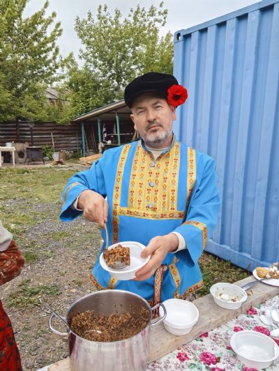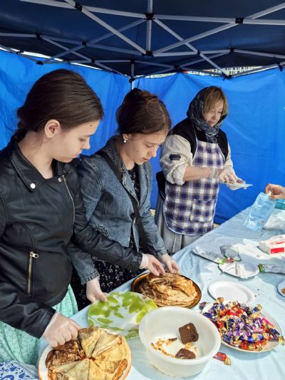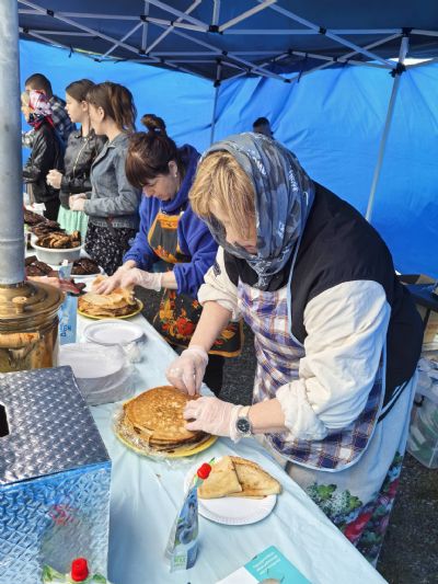 Всех угощали полевой кашей, а также знаменитыми и очень вкусные блинами, чаем и сладостями от «Русской Общины».