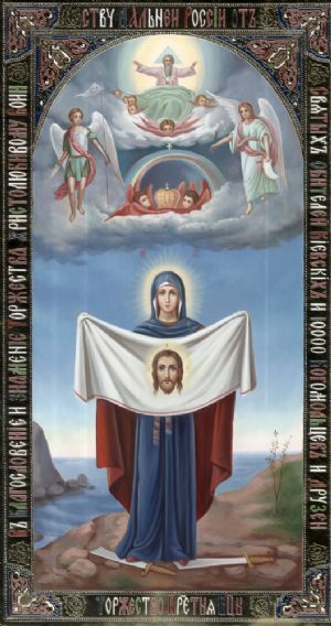 Нашим взорам предстала Божия Матерь, стоящая Своими стопами на берегу залива на двух поверженных и обломанных мечах. Она одета в синюю ризу. Верхнее облачение коричневого цвета. Плат на голове тоже синий. Вокруг головы яркое сияние. В руках Богородица держит белый плат с ликом Христа Спасителя. Из-под убруса свисает разноцветный пояс. Позади Божией Матери находится морской залив, который на горизонте сливается с голубым небом. Выше Богородицы в облаках справа стоит Архангел Михаил с огненным мечом, слева - Архангел Гавриил с цветущей ветвью в руке. Между ними Херувимы держат царскую корону, а над ними - две перекрещивающиеся радуги увенчиваются крестом. Еще выше в окружении Небесных Сил Бесплотных восседает Господь Саваоф, над которым в сиянии надпись: "Да будет едино стадо и един пастырь". По периметру иконы на золотом фоне эмалевой вязью написано: "Торжество Пресвятой Богородицы. В благословение и знамение Торжества христолюбивому воинству Дальней России от святых обителей Киевских и 10 000 богомольцев и друзей".