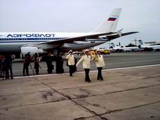 Как только торжественная церемония в аэропорту закончилась, ковчег со святыми мощами перенесли в бронетранспортер, стоявший неподалеку, чтобы на нем перевезти их в храм. В боевой машине для сопровождения честных мощей находился игумен Никон (Анненков), настоятель Свято-Серафимовского мужского монастыря.