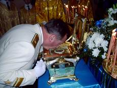 Из боевой машины отец Никон передал ковчег двум высшим офицерам флота, которые донесли святыню до храма, на паперти которого ковчег принял ключарь собора игумен Филарет (Тамбовский), внесший затем святые мощи в собор. Следом туда зашли Высокопреосвященный архиепископ Варсонофий, дальневосточные Преосвященные Вениамин, Марк и Феофан, духовенство, официальные гости, офицеры и богомольцы.