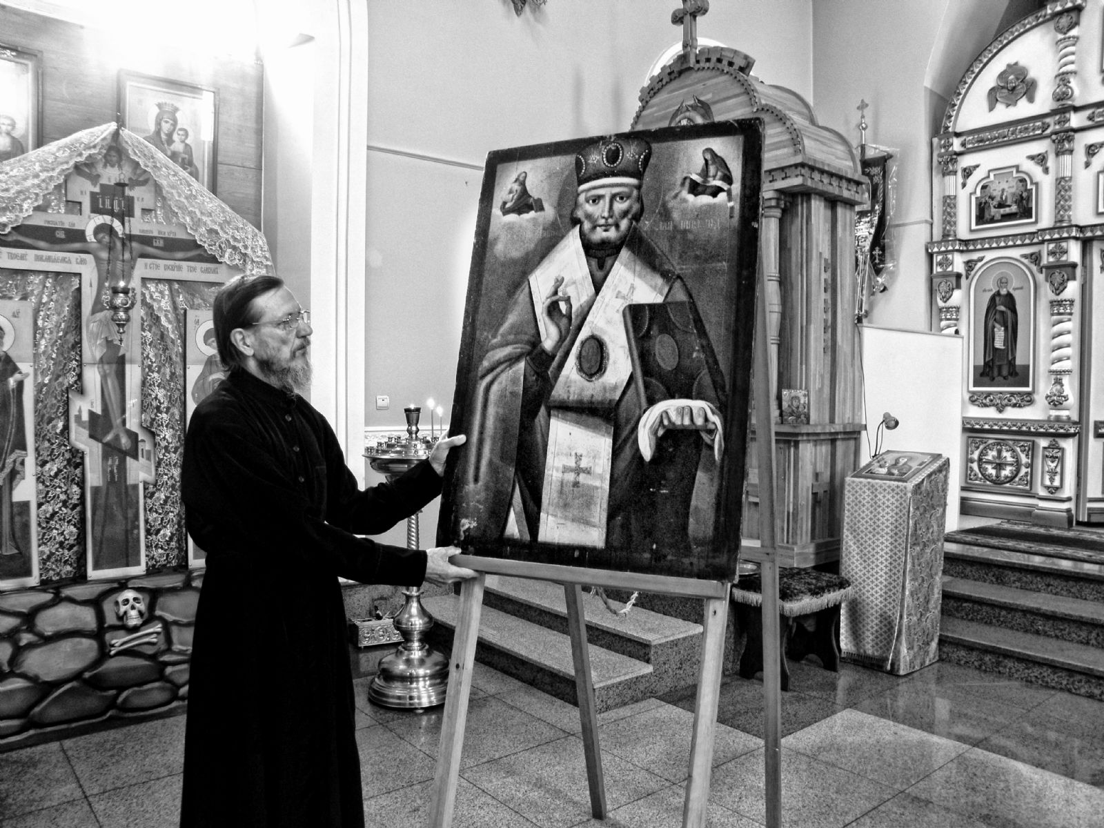 Настоятель храма протоиерей Георгий Зуев трепетно с благодарностью принял дар, и тут же установили, что каждый четверг перед иконой Николая Чудотворца будет совершаться молебен.