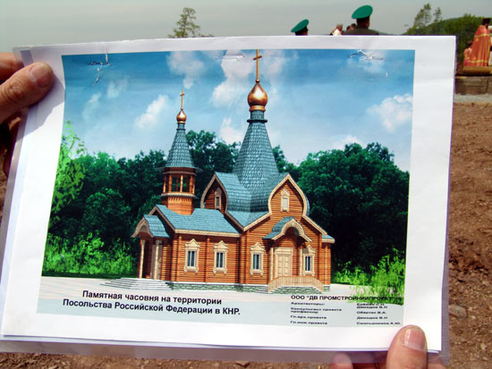 Высота будущего храма 17 метров, длина - 18, а ширина - 9. Сруб бревенчатый. Подробно о будущем строении рассказывает Евгений Слепов, руководитель работ. Первоначально речь шла о строительстве храма на территории российского посольства в Пекине. Но когда дошло до дела, официального согласия китайской стороны не было получено, несмотря на предварительную договоренность. Так было решено заложить храм на границе.