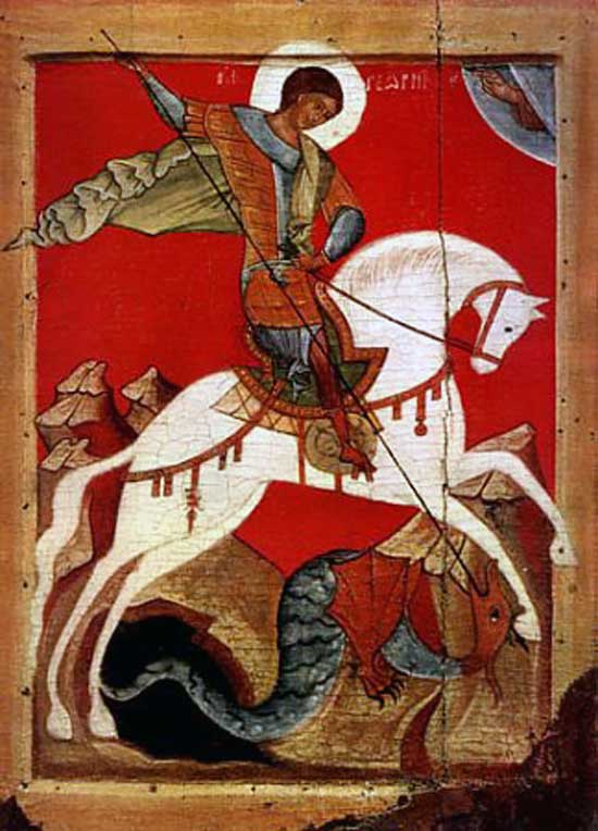 На золотистом фоне в самом центре иконы, занимая ее почти целиком, парит на белом коне всадник. Легок его конь, легка его фигура в золотисто-зеленой кольчуге и ярко-алом плаще. Окруженный нимбом, не напряжение борьбы, а покой и светлую надежду выражает его лик. Георгий поражает змия, а с Небес (в правом верхнем углу иконы) протянута к нему благословляющая Десница Божия.