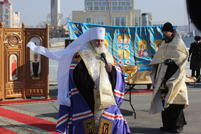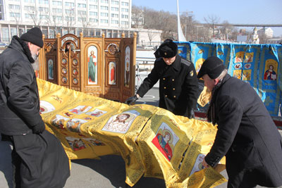 На 33-м причале главной базы Тихоокеанского флота, у ракетного крейсера «Варяг», состоялась торжественная передача иконостасов для походных храмов трех кораблей ТОФ.