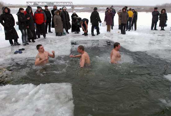 обливания освященной водой. Так в селе залива "морская" Владимиро-Александровском прихожанами была устроена прорубь в р. Партизанской. В Крещенскую ночь погружались в ледяную воду и в храме св. прав. Иоанна Кронштадтского г. Владивостока. Там прямо на территории прихода был установлен 15 тонный бассейн. А на спортивной набережной для желающих погрузиться в Крещенские воды была вырублена во льду Амурского купель.