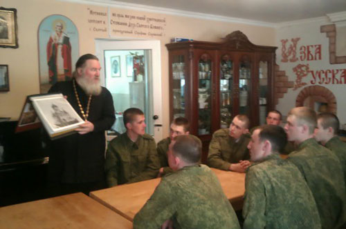 — Особенно на большие праздники в храмах бывает много военнослужащих. На Пасху в Серафимовский храм приезжали воины из воинской части № 11388. Мы рассказали солдатам об истории и устройстве храма. Мой помощник по социальному служению Л. Ивашкова и руководитель воскресной школы Н. Андрейкина напомнили о добрых связях Церкви и армии, традиционных и современных, а также научили солдат писать записки за здравие своих близких, ставить свечи, прикладываться к иконам и мощам. За чашкой чая вспоминали легендарного полководца А. В. Суворова, который особое внимание обращал на духовные качества российского воинства: благочестие, героизм, долг, патриотизм. Русская Церковь для нашей страны является гарантом суверенитета России, условием сохранения её уникальности и самобытности перед лицом глобализации… На память о посещении храма подарили военнослужащим православную литературу. А они, кстати, помогли нам в ответ: починили неисправность в приходской видеоаппаратуре. С сопровождавшим солдат подполковником А. А. Агаповым мы обсудили во время встречи возможности дальнейшего сотрудничества.