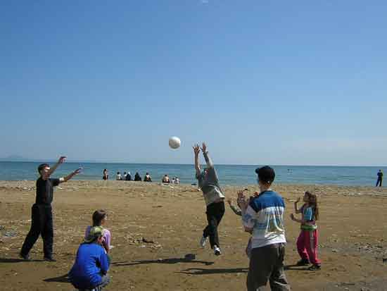 Володя был за фотографа, а Сергей за организатора выезда. 40 мест в автобусе, плюс машины с тех.инвентарем. На Шаморе оказалось не так солнечно, как в городе. Облака, местами тучки. Зато море было великолепно: огромные волны с игривыми пенистыми гребнями. Дети сразу полезли в воду и взялись бросать камни. А на поляне кипела работа по разведению костра.