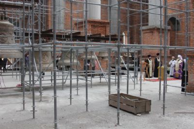 На фоне кирпича и строительных лесов освящали голос строящегося собора. Четыре благовеста и дозвоны прибыли во Владивосток, чтобы занять свое место в Спасо-Преображенском соборе – самом большом на Дальнем Востоке. Освящал колокола митрополит Приморский и Владивостокский Вениамин.