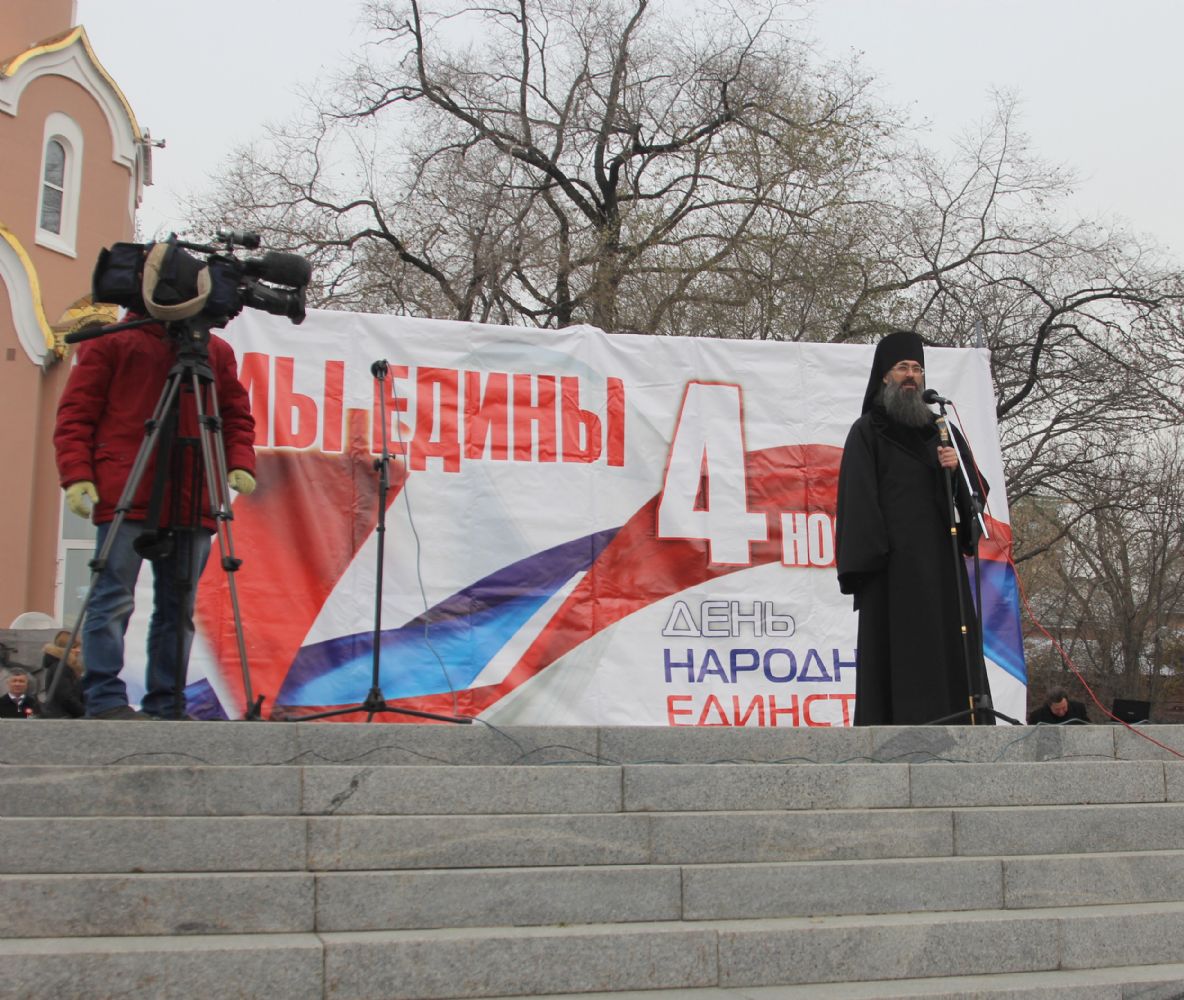 Владыка Иннокентий, обращаясь к участникам праздничного митинга, поздравил приморцев с праздником Казанской иконы Божией Матери и, в частности, отметил духовное и государственное значение празднования Дня народного единства: