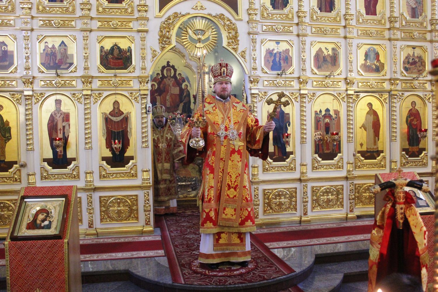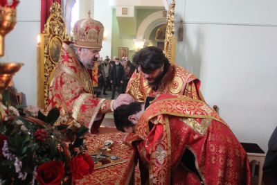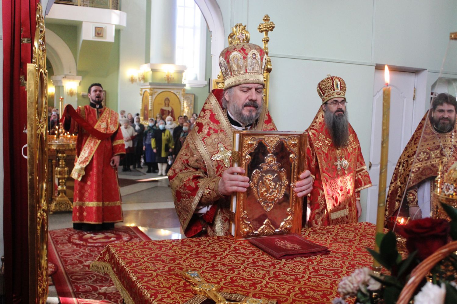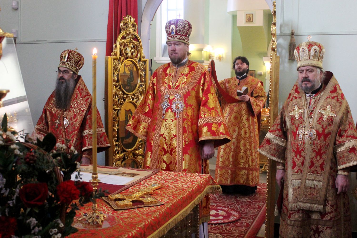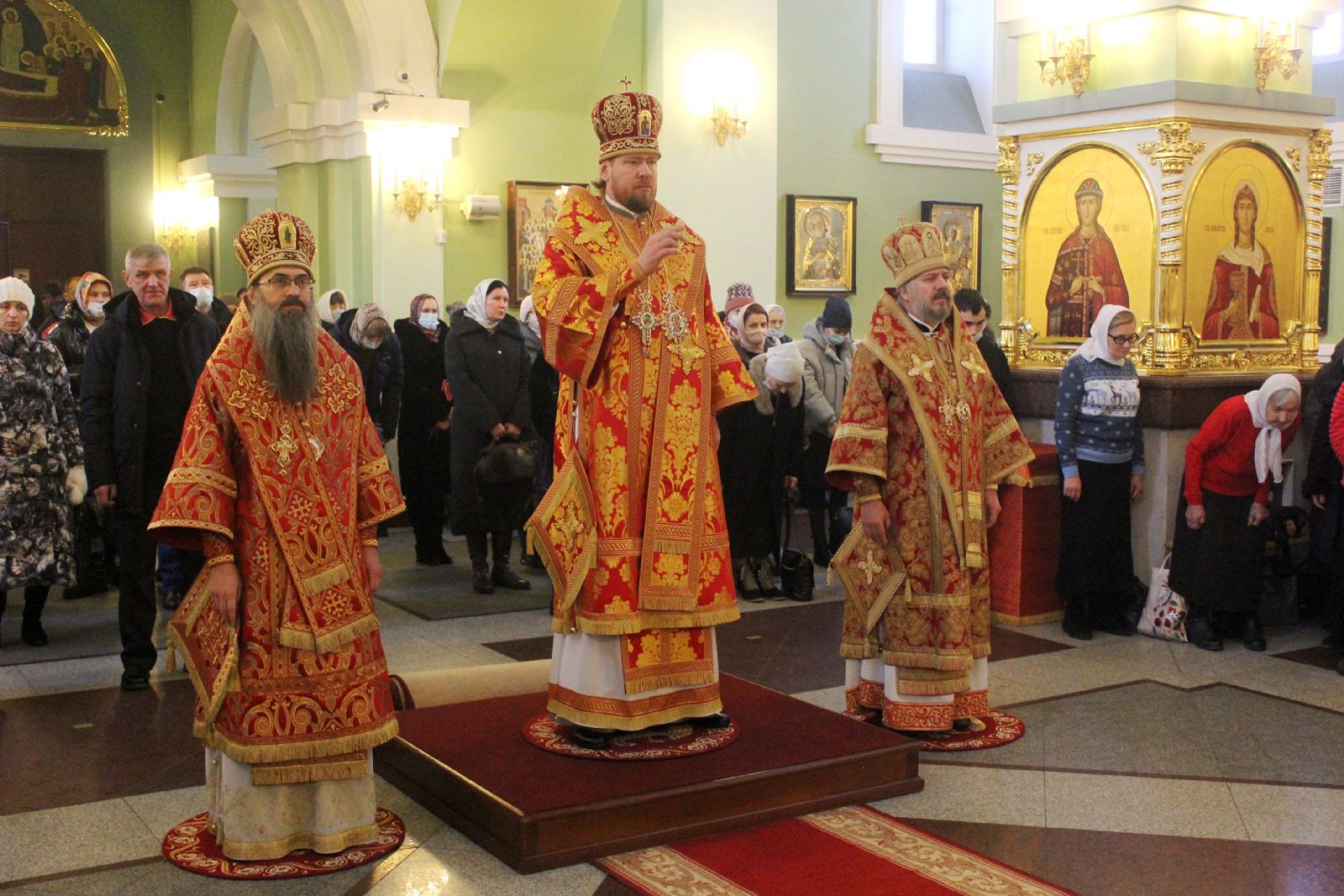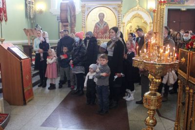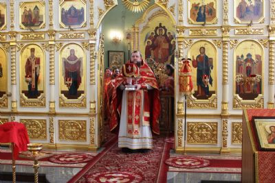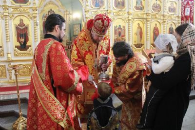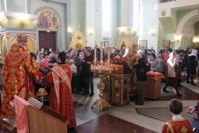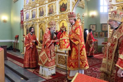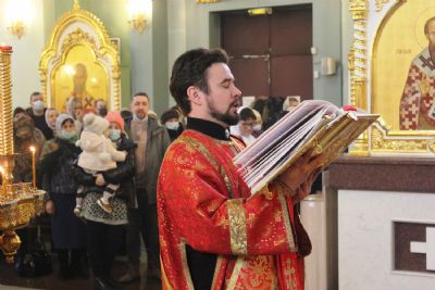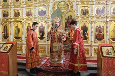После сугубой ектении архипастырями были вознесены: молитва ко Господу о завершении строительства Спасо-Преображенского кафедрального собора, молитва во время распространения вредоносного поветрия чтомая и молитва о здравии митрополита Вениамина (Пушкаря) и игумении Варвары с сестрами Богородице-Рождественской обители.