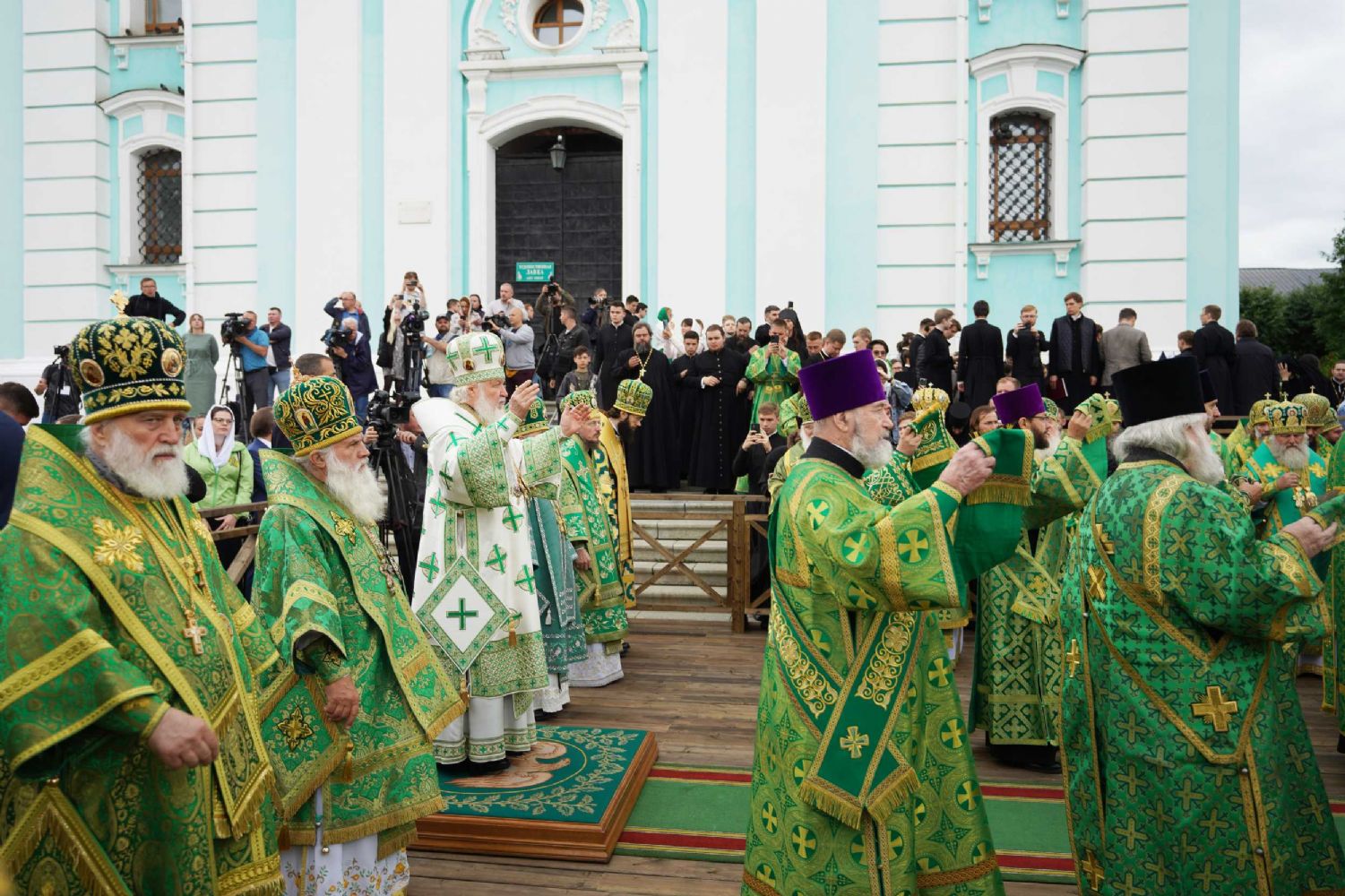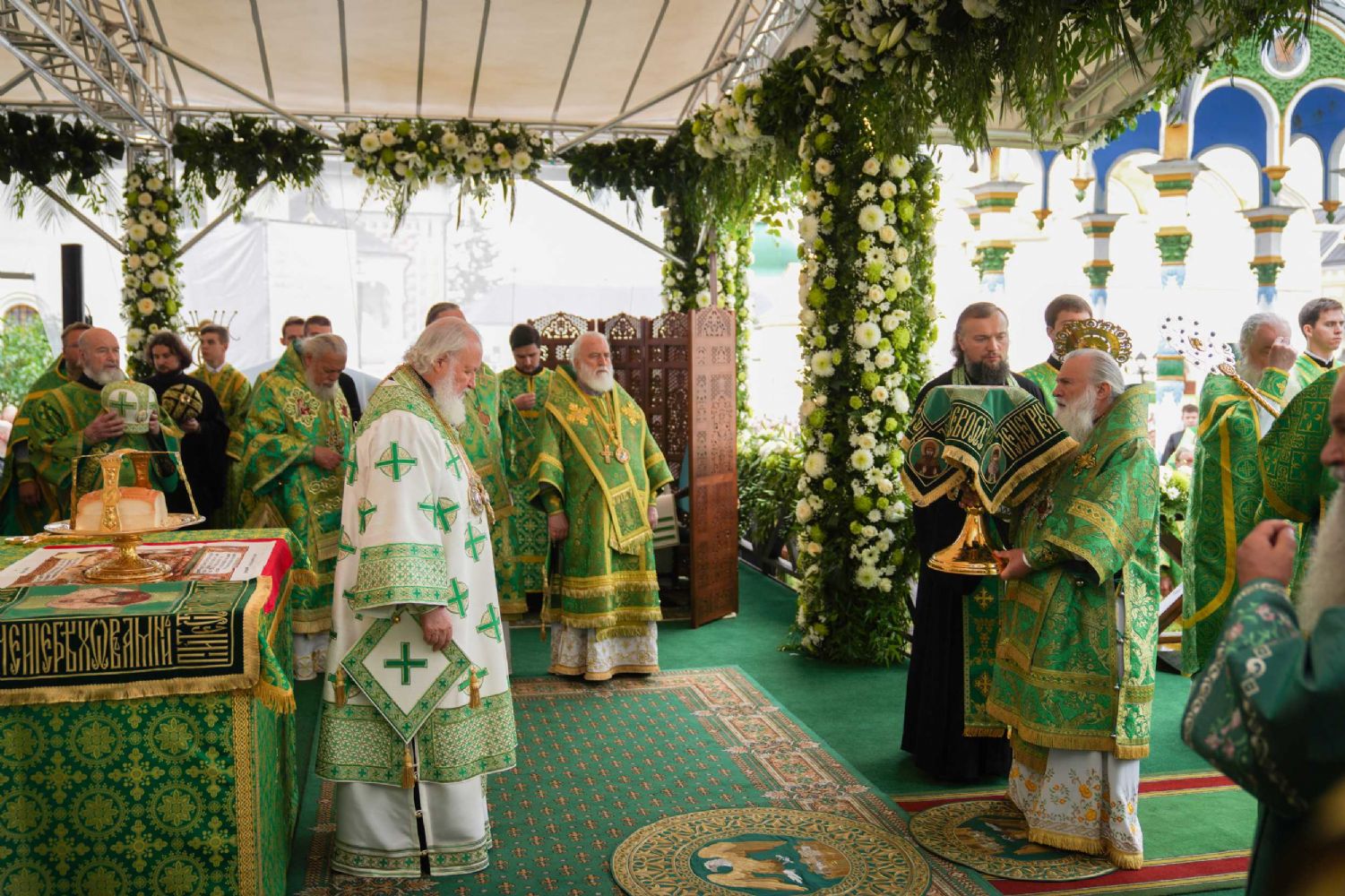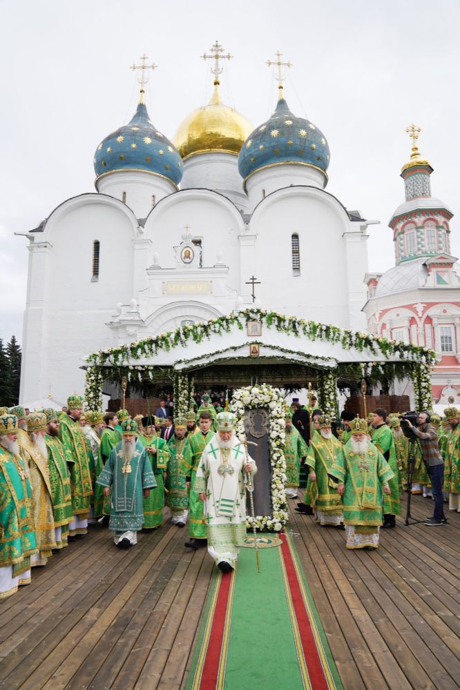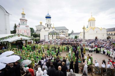 Центральным событием юбилейных мероприятий стали торжественные богослужения Предстоятеля Русской Православной Церкви в сослужении собора архипастырей и духовенства на Соборной площади Троице-Сергиевой лавры.