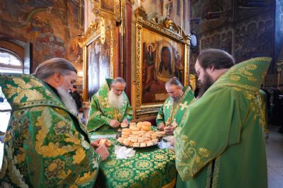 По окончании Литургии Святейший Патриарх Кирилл, члены Священного Синода и все иерархи, прибывшие на праздник в Лавру, совершили молебен преподобному Сергию Радонежскому.