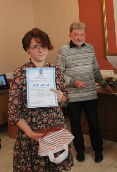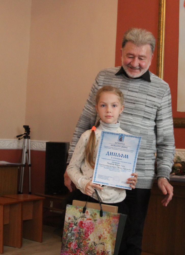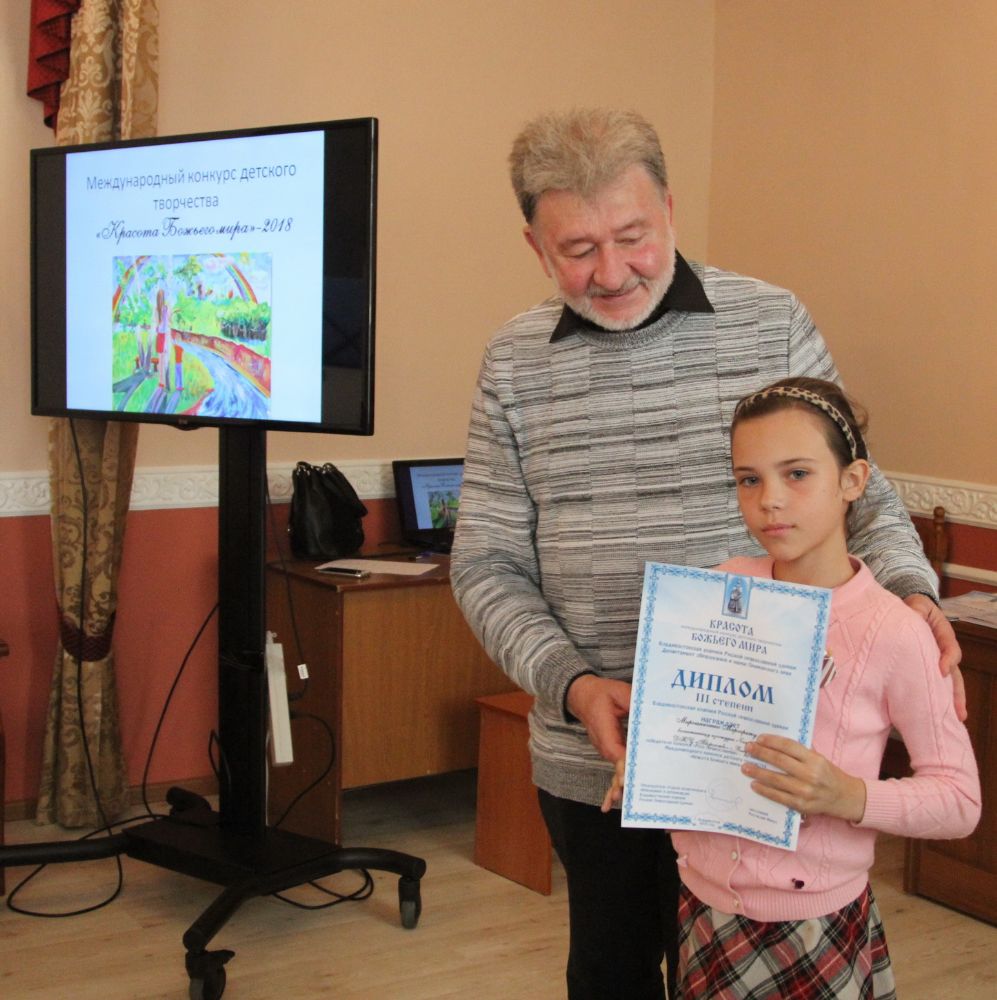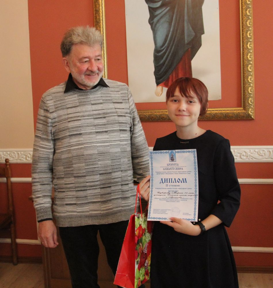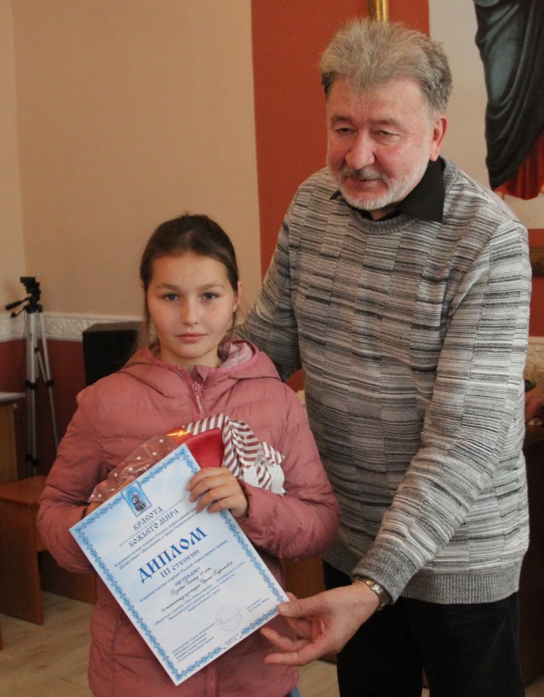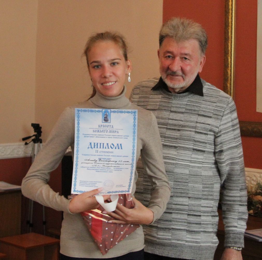 Дипломы вручали Иван Александрович Ермолаев, Председатель жюри конкурса, заведующий художественным отделением Детской школы искусств № 3 г. Владивостока и методист епархиального отдела религиозного образования и катехизации Елена Дмитриевна Тимошенко.
