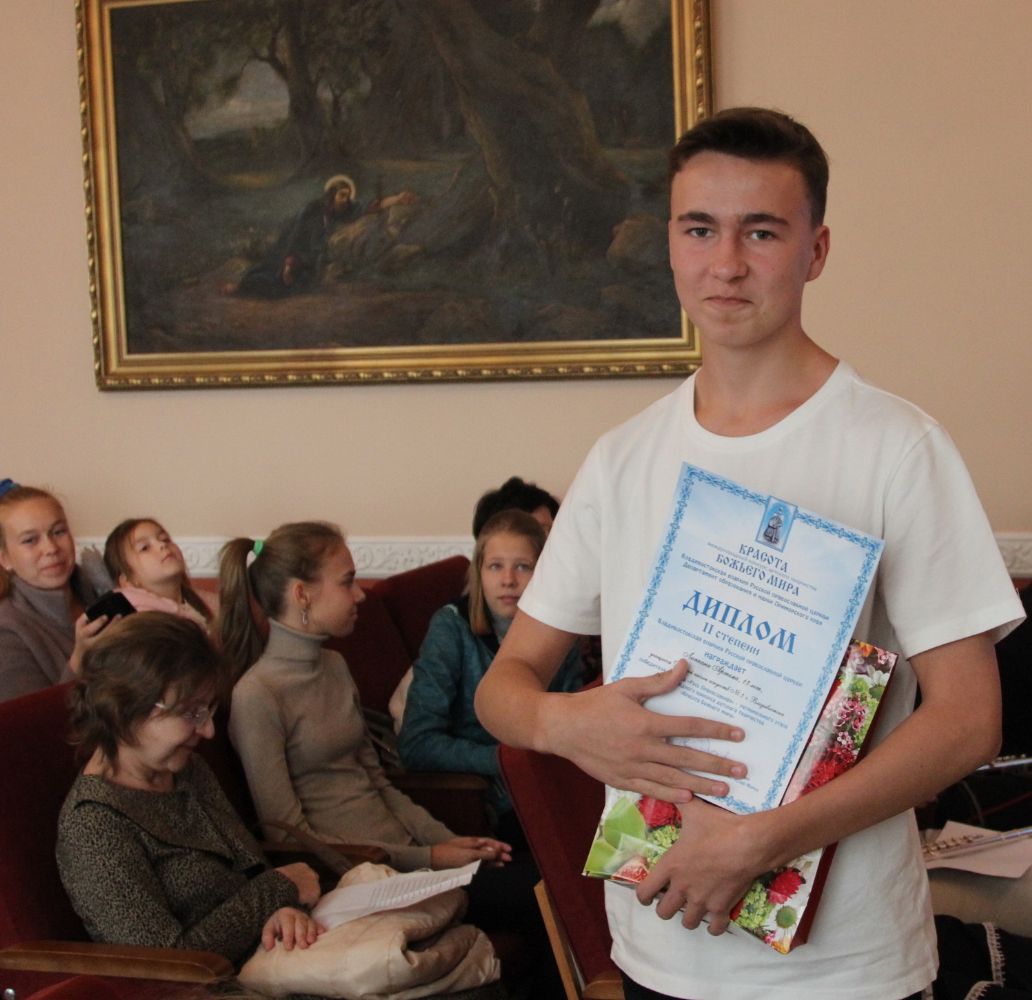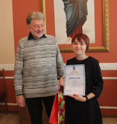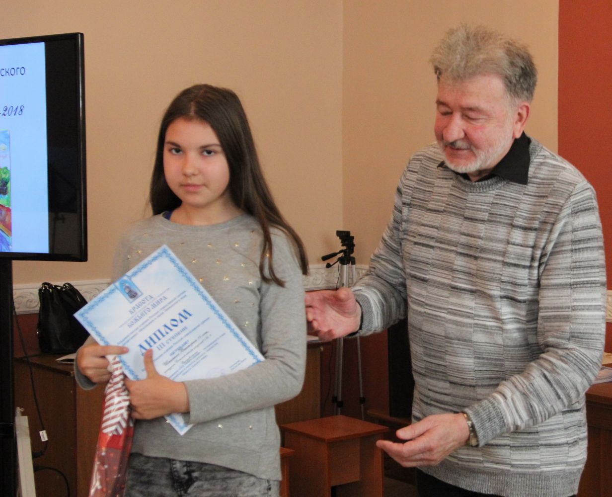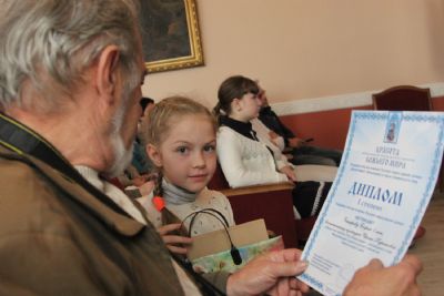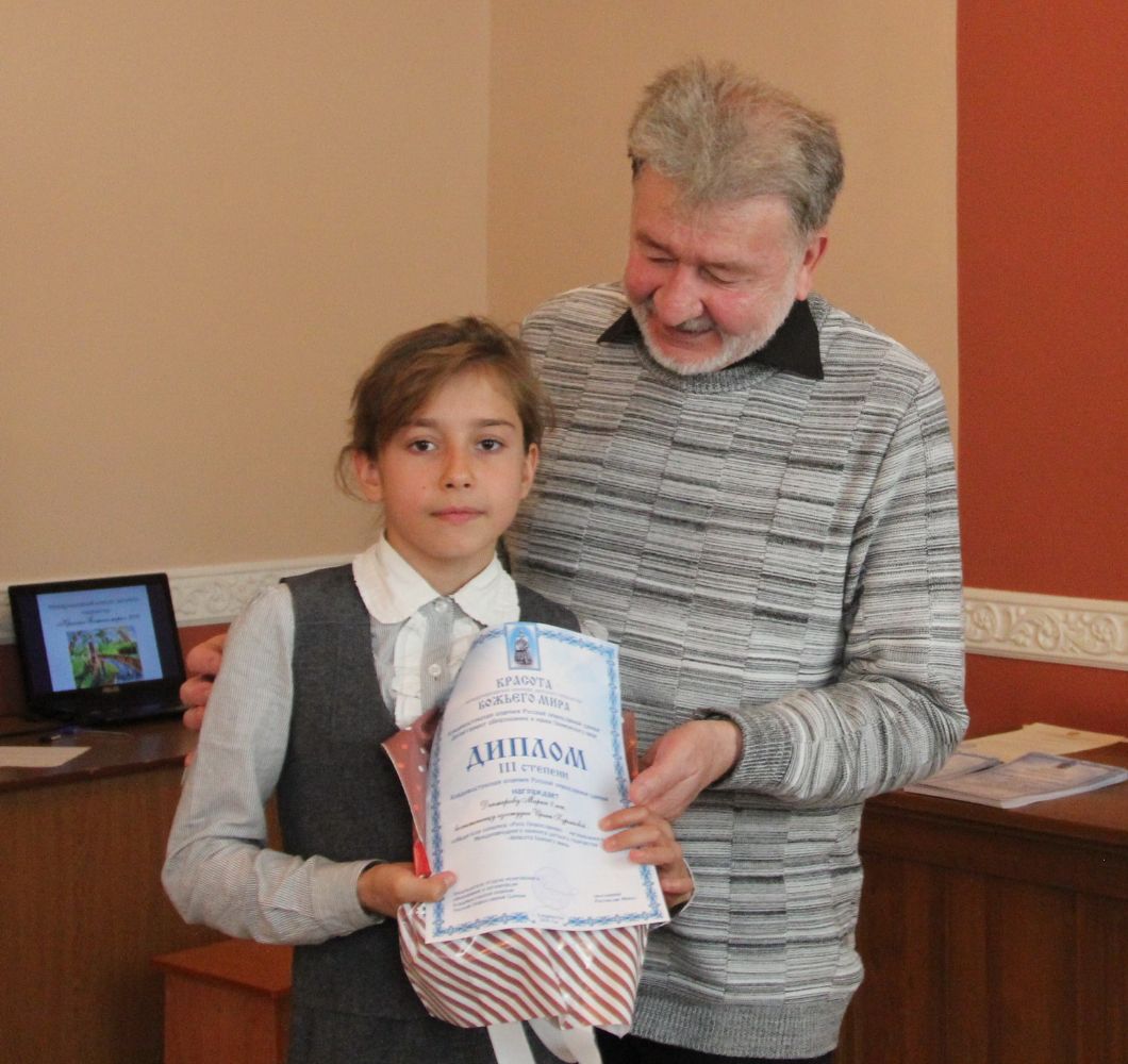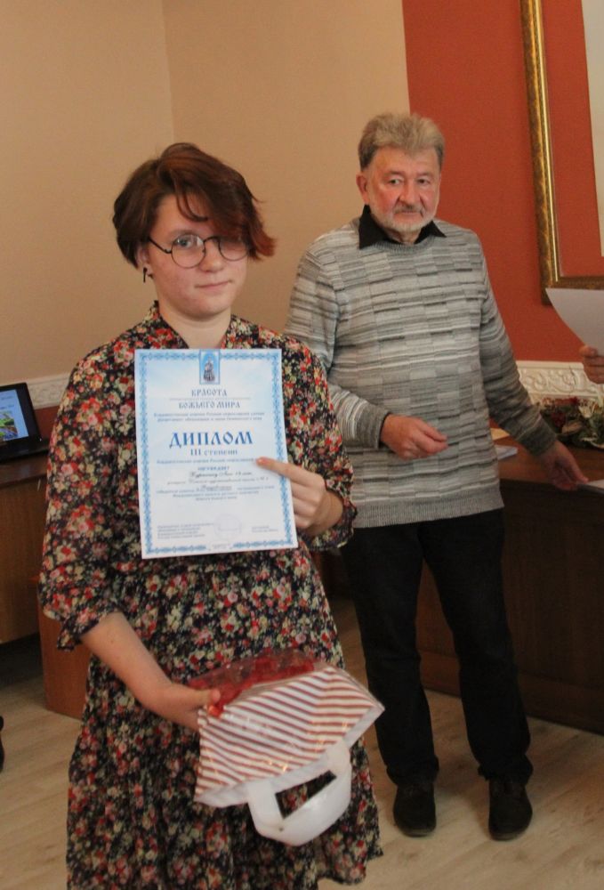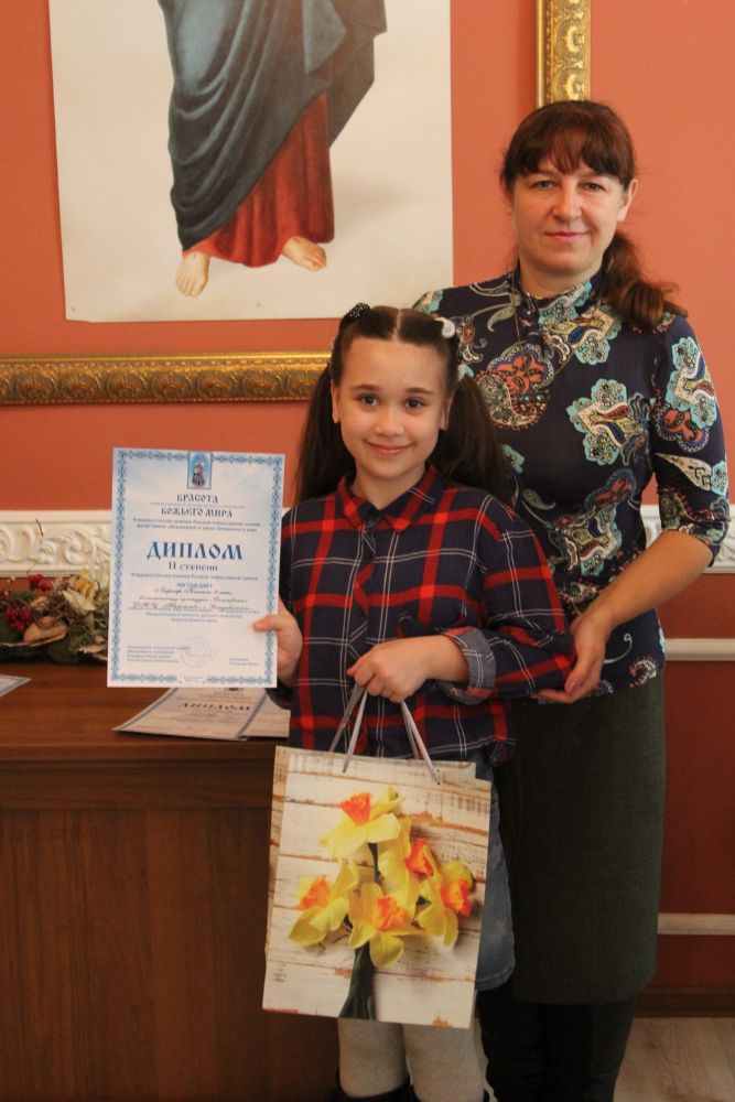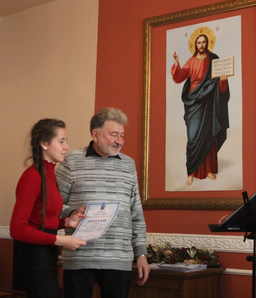 Дипломы вручали Иван Александрович Ермолаев, Председатель жюри конкурса, заведующий художественным отделением Детской школы искусств № 3 г. Владивостока и методист епархиального отдела религиозного образования и катехизации Елена Дмитриевна Тимошенко.