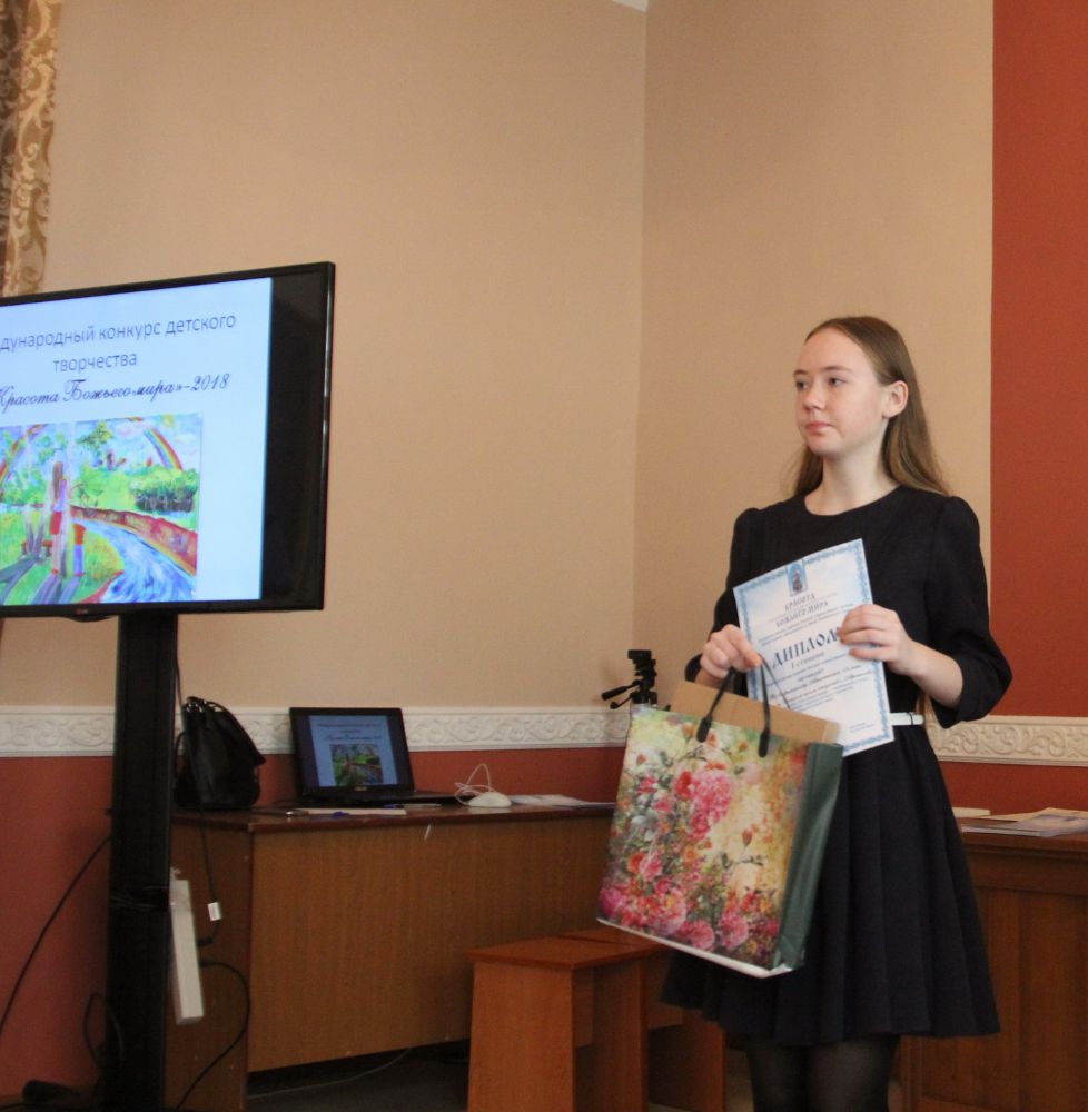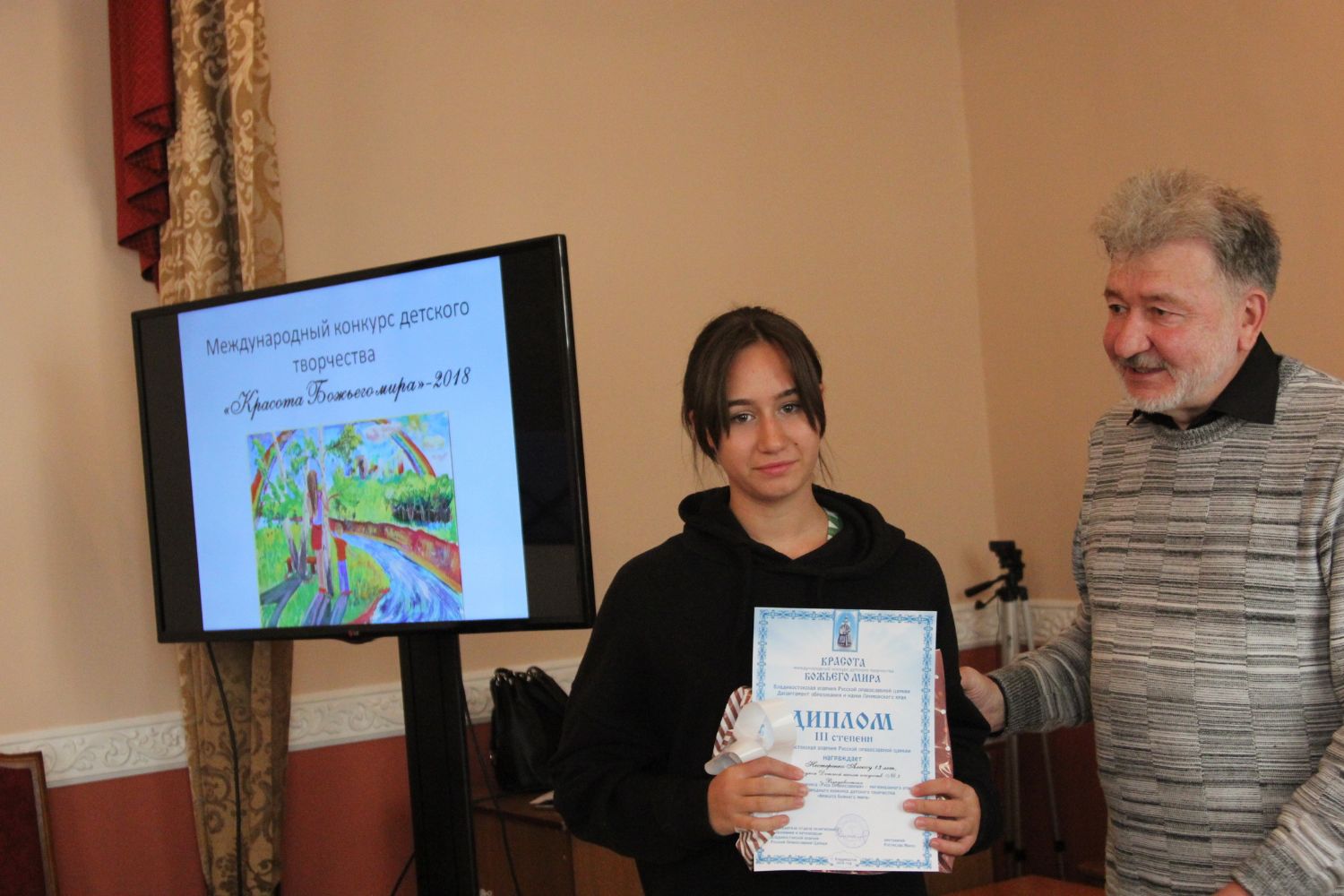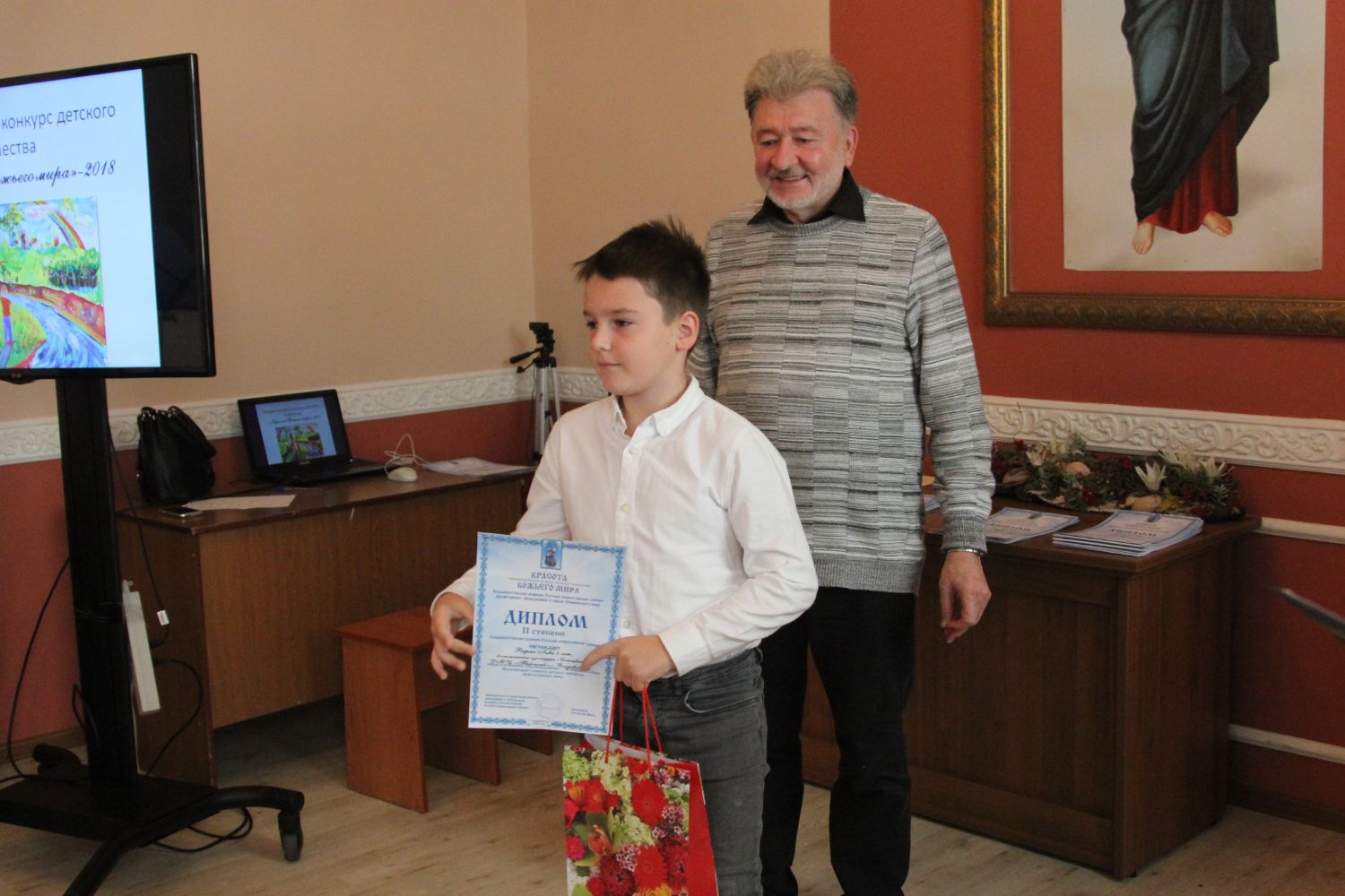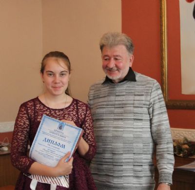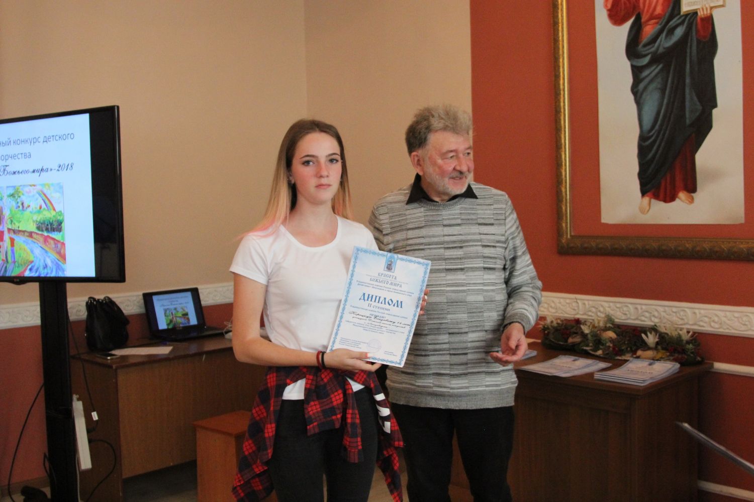 Дипломы вручали Иван Александрович Ермолаев, Председатель жюри конкурса, заведующий художественным отделением Детской школы искусств № 3 г. Владивостока и методист епархиального отдела религиозного образования и катехизации Елена Дмитриевна Тимошенко.