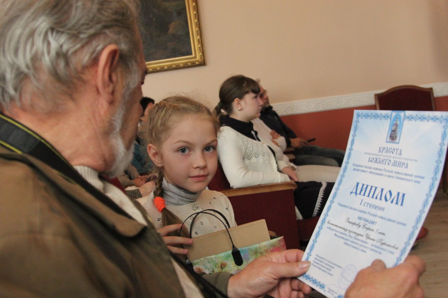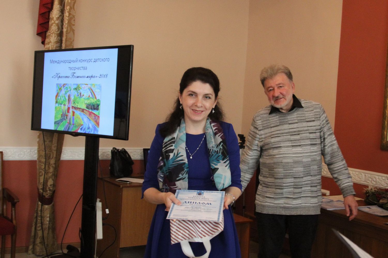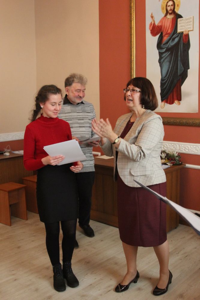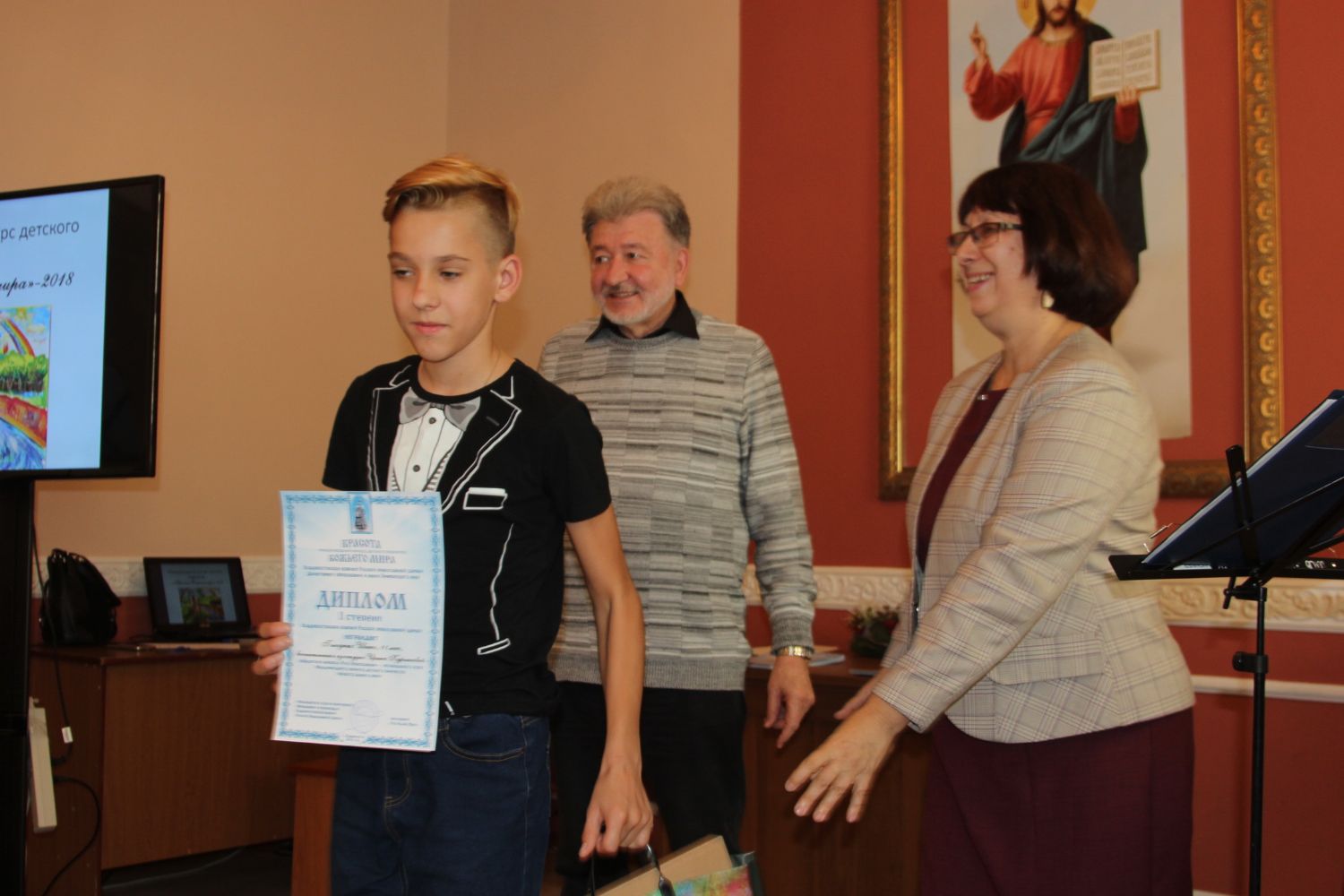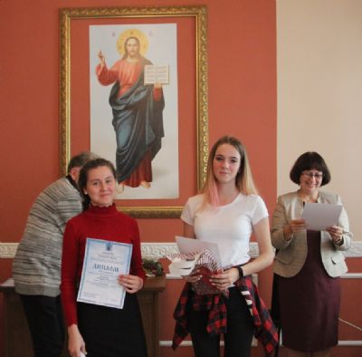Дипломы вручали Иван Александрович Ермолаев, Председатель жюри конкурса, заведующий художественным отделением Детской школы искусств № 3 г. Владивостока и методист епархиального отдела религиозного образования и катехизации Елена Дмитриевна Тимошенко.