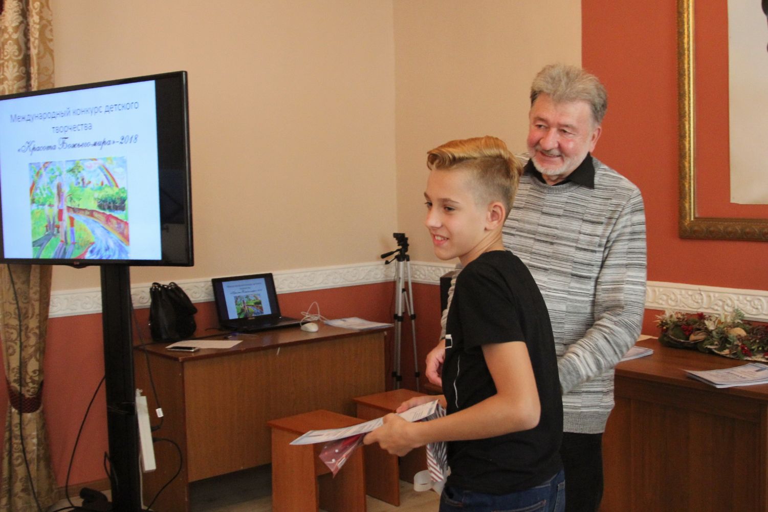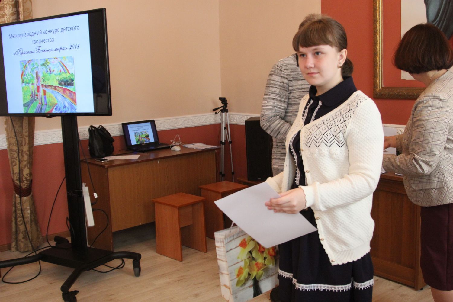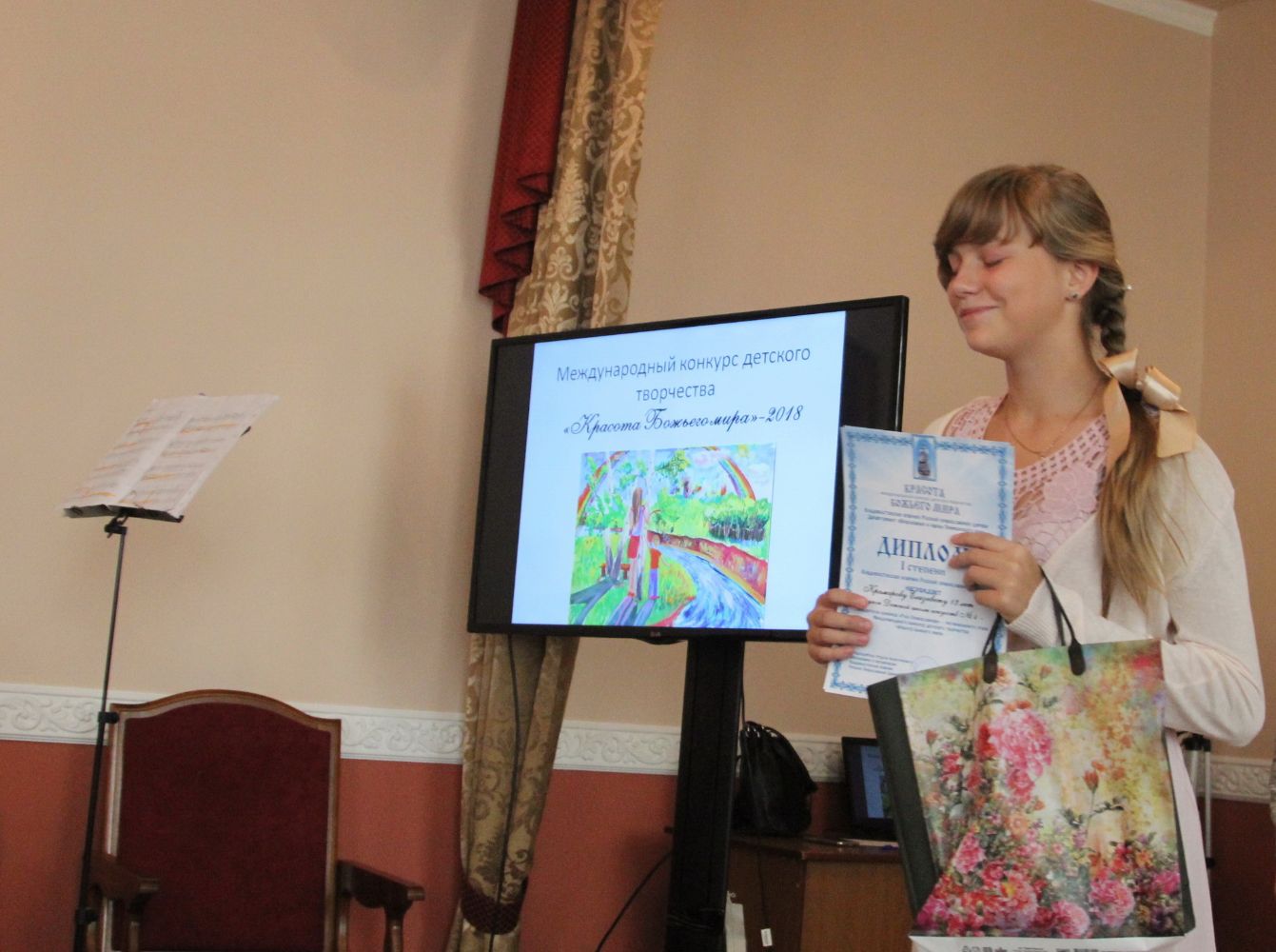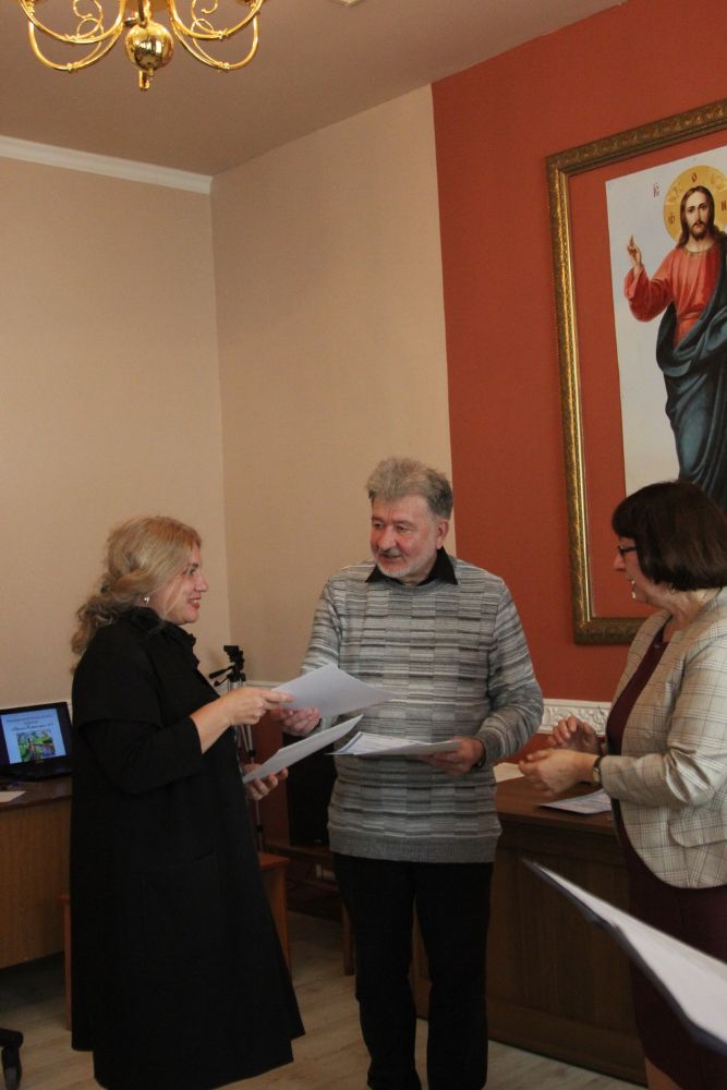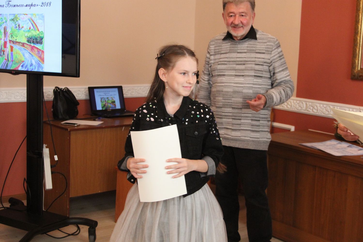 Дипломы вручали Иван Александрович Ермолаев, Председатель жюри конкурса, заведующий художественным отделением Детской школы искусств № 3 г. Владивостока и методист епархиального отдела религиозного образования и катехизации Елена Дмитриевна Тимошенко.