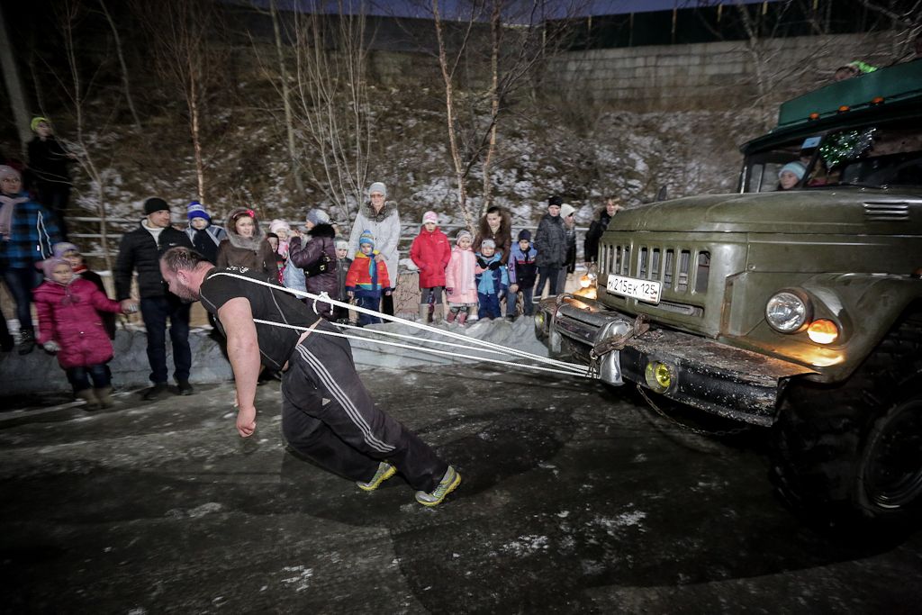 Праздник для детей начался в 18.00, а в 19.30 местный силач, мастер спорта по жиму лежа, а также многократный победитель соревнований по пауэрлифтингу и жиму лежа в Приморском крае продемонстрировал свою силу, протащив 13-тонный грузовик почти на 15 метров.