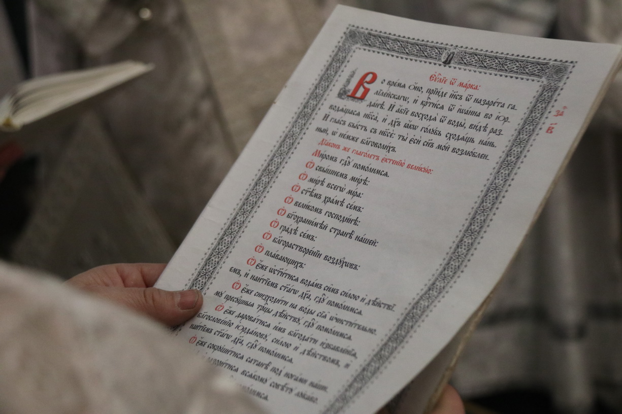 По заамвонной молитве епископ Николай в сослужении духовенства собора совершил чин Великого освящения воды, по окончании которого возглавил праздничное славление и обратился к молящимся с проповедью о празднике Святого Богоявления: