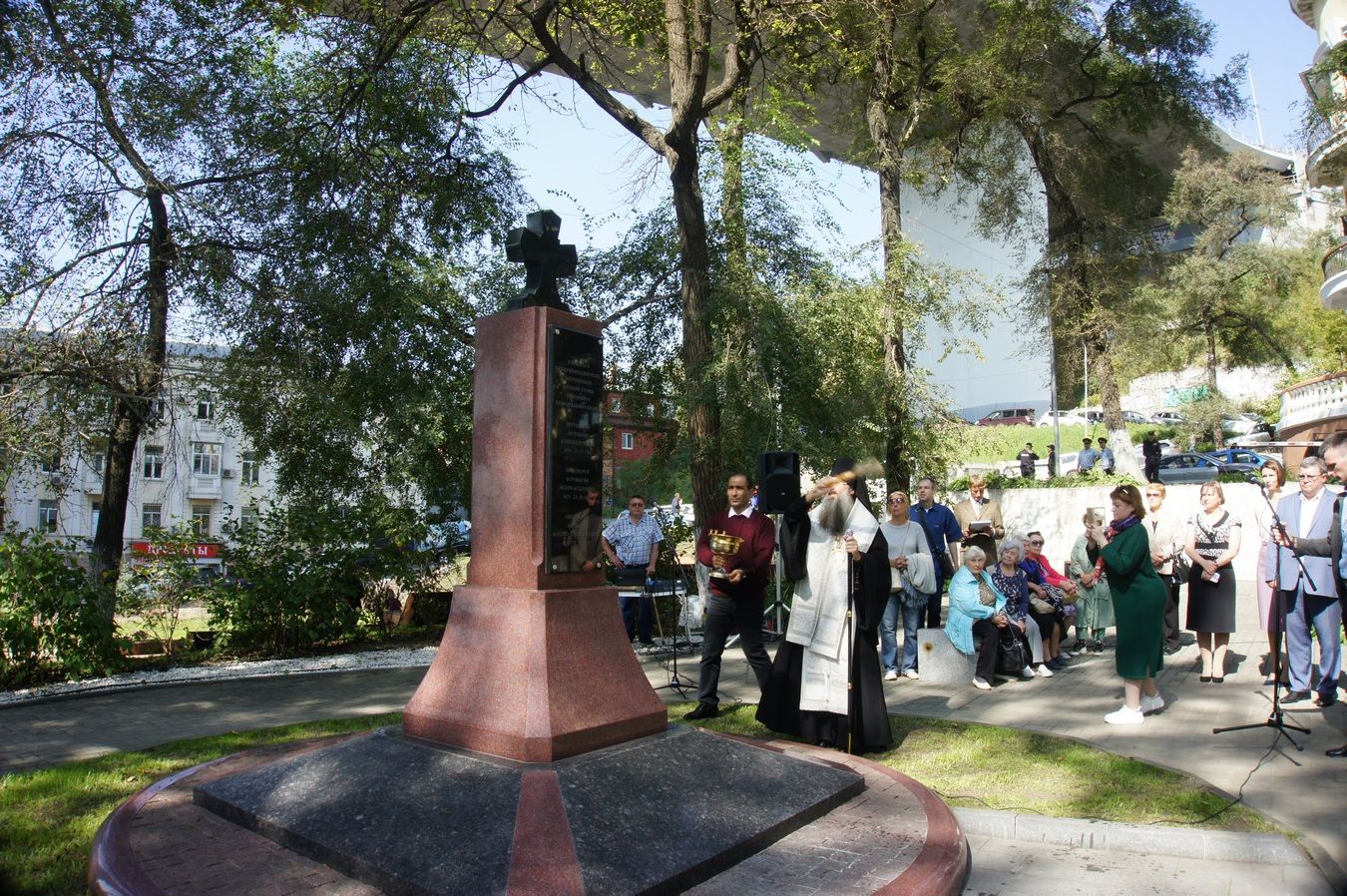 Почетное право открытия мемориального креста было предоставлено главе города Владивостока Олегу Гуменюку и владыке Иннокентию. После того, как с памятника было снято белое полотно, глазам зрителей предстала усеченная пирамида, над которой возвышается православный крест, а на одной из граней, обращенной к Успенскому храму, прикреплена мемориальная табличка с именами захороненных здесь священников. Это протоиерей Александр Ильич Муравьёв (1856 - 31.12.1918), протоиерей Иоанн Фёдорович Верещагин (1820 - 24.08.1872) и священник Михаил Александрович Воронцов (1837 - 02.06.1882).