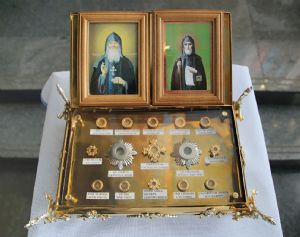 В храме пребывает ковчег (мощевик) с частицами мощей 15 святых угодников Божиих: