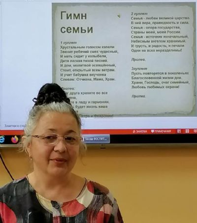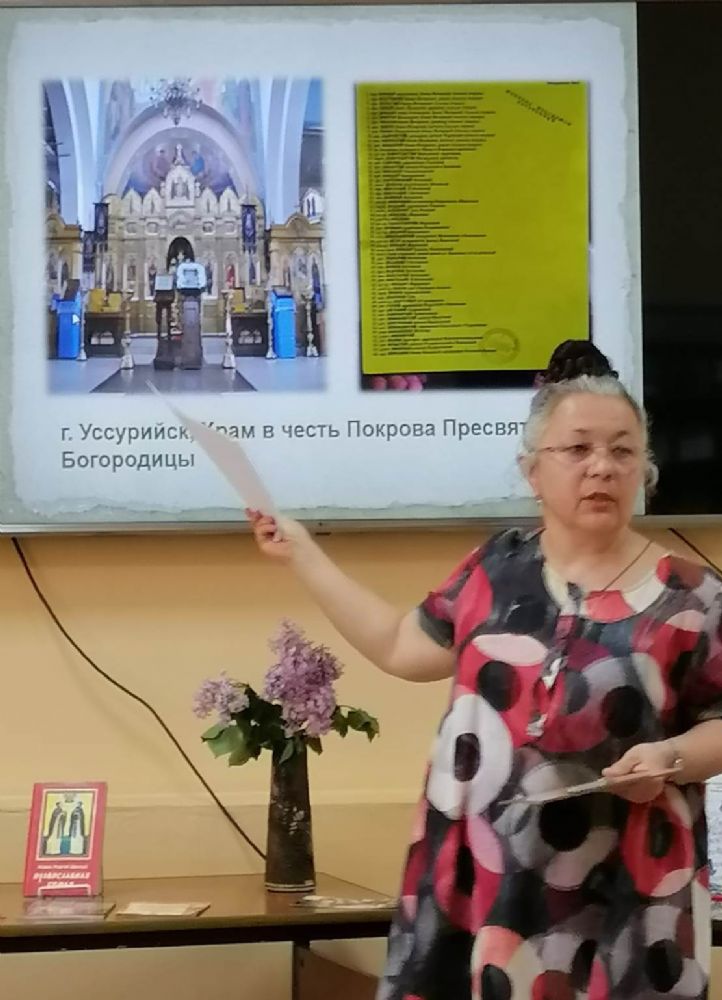 Филатова Елена, студентка выпускного курса Центра подготовки церковных специалистов Владивостокской епархии, провела для членов общества интерактивную беседу «Воспитание святостью» о святых Петре и Февронии Муромских.