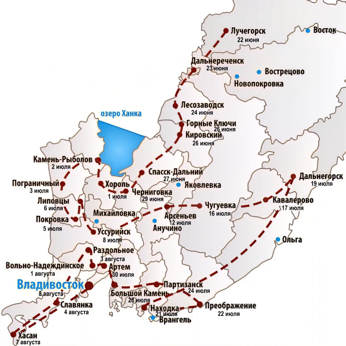 По планам торжественное освящение иконы состоится 22 июня в Спасо- Преображенском кафедральном соборе города Владивостока. Далее икона отправится до Лучегорска и дальше по многим городам и весям Приморской земли. В каждом населенном пункте будут совершаться Богослужения, а в промежутках между службами икона будет посещать воинские подразделения, где вместе с воинами будет возможность помолиться о крепости нашего воинства перед образами святых, покровителях нашего воинства. (см. Таблица 2 «Описание маршрута»).
