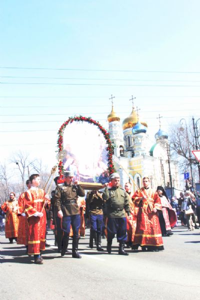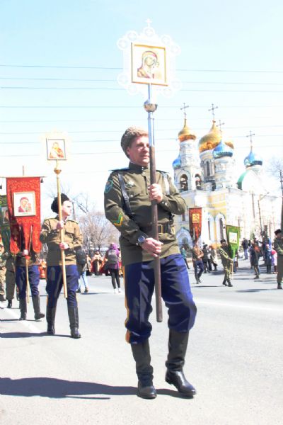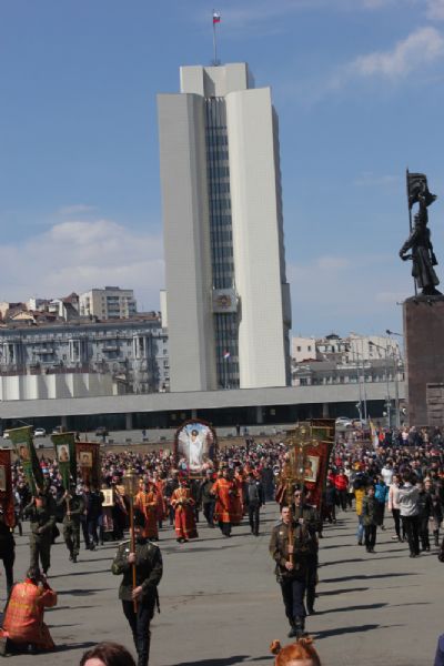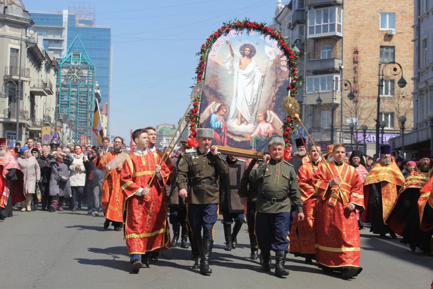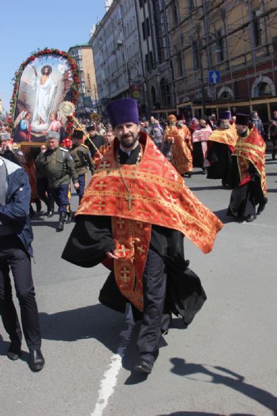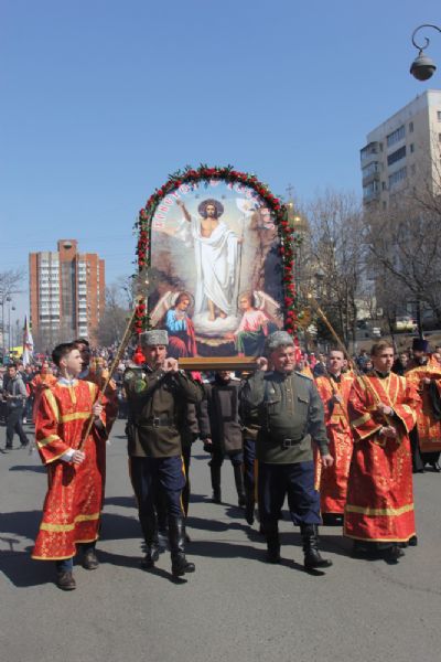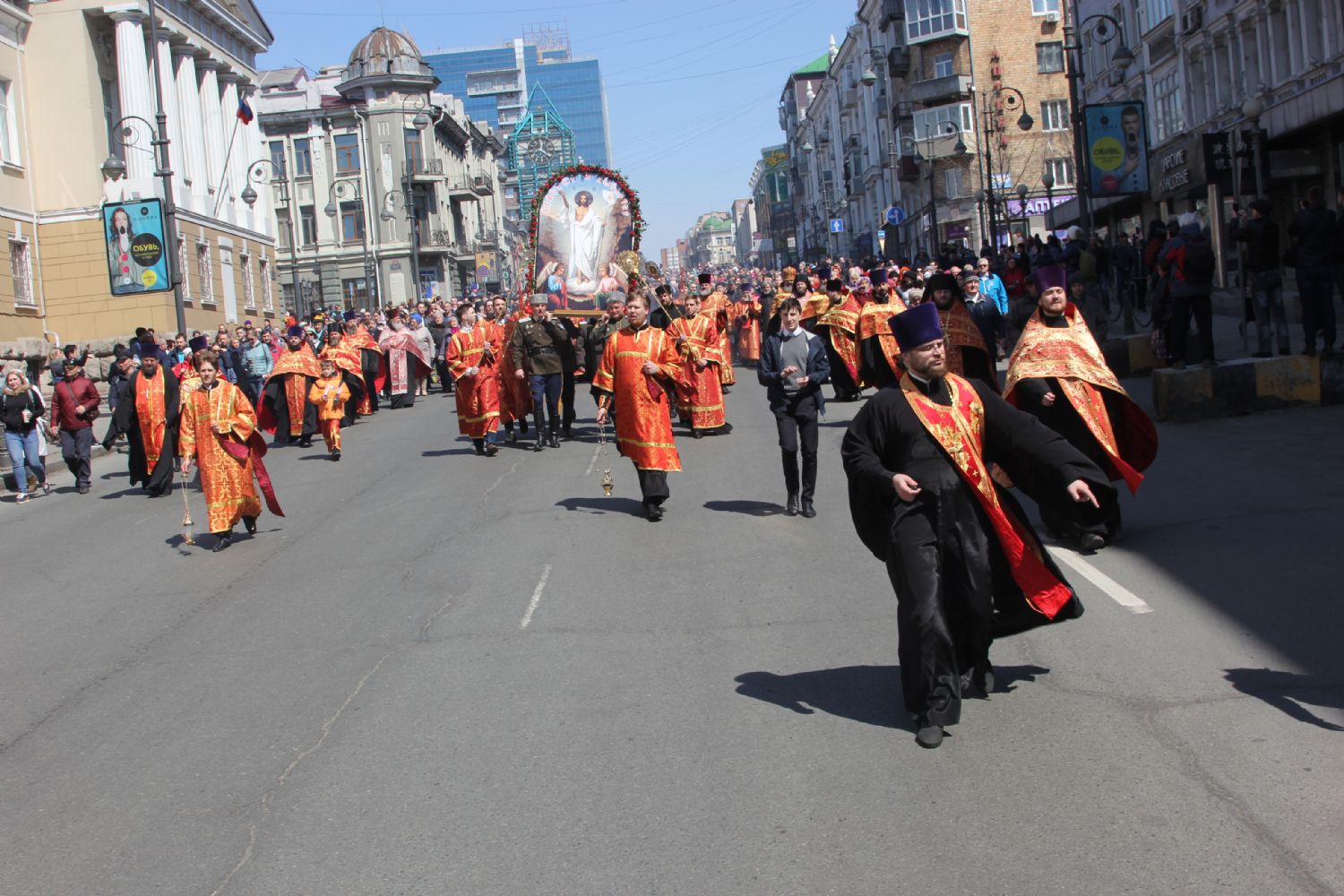 В городскую праздничную колонну вошли руководители епархиальных отделов, настоятели и клир храмов и монастырей, представители приходов, общественных организаций, казачества и учебных заведений — Духовного центра, православной гимназии. Сбор колонны начинался в Покровском кафедральном соборе, где после пасхальных богослужений прошло также освящение куличей — за православной традицией с интересом наблюдали гости Владивостока, туристы из стран АТР.