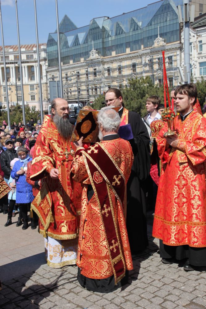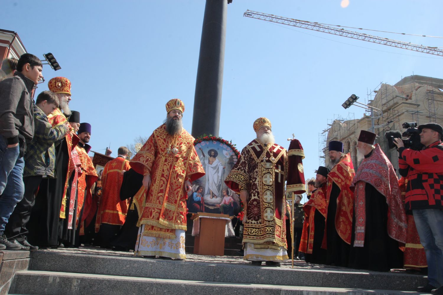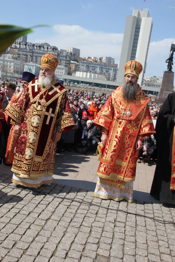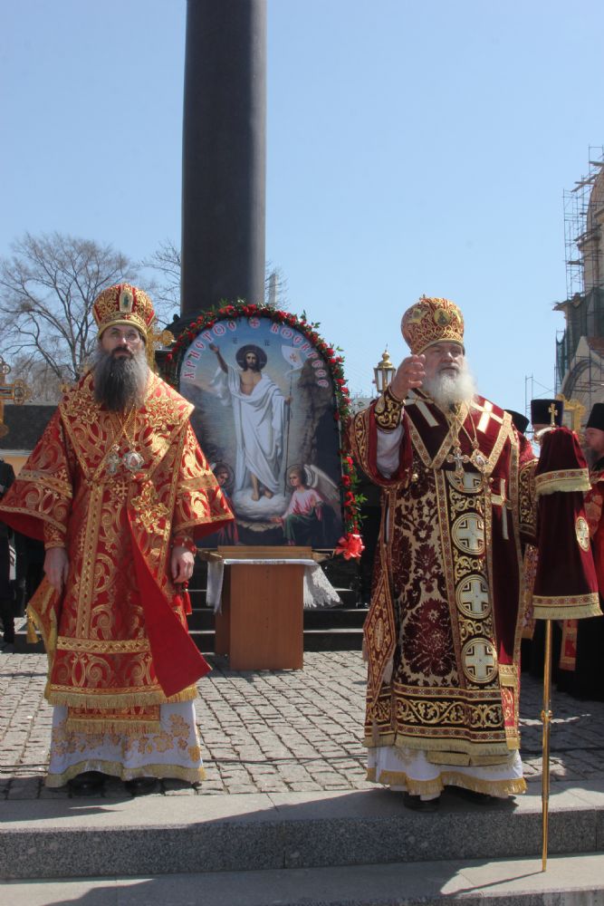 Митрополит Владивостокский и Приморский Вениамин встречал Пасхальный Крестный ход у стен строящегося Спасо-Преображенского собора. Перед иконой праздника Воскресения Христова, установленной на площадке стелы «Владивосток — город воинской славы», архиереи епархии совершили праздничный молебен, в сослужении которого принимали участие секретарь епархии протоиерей Игорь Талько; благочинный I округа, председатель Преображенского приходского совета протоиерей Димитрий Федорин; и клирик временного храма при приходе Преображенского собора иерей Александр Карапетян. Накануне, в Великую Субботу Страстной седмицы, совпавшую с праздником Благовещения Пресвятой Богородицы, на стройплощадку собора были доставлены первые купола.