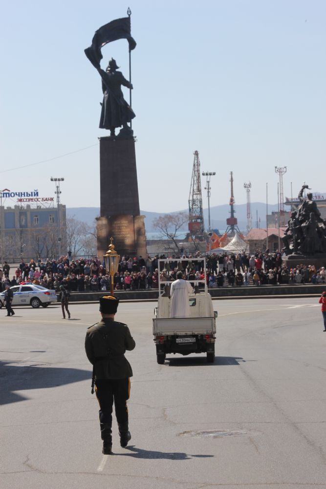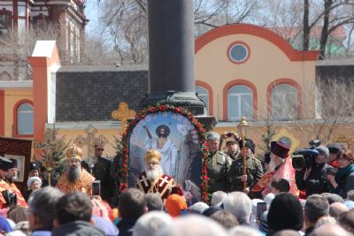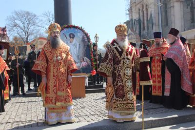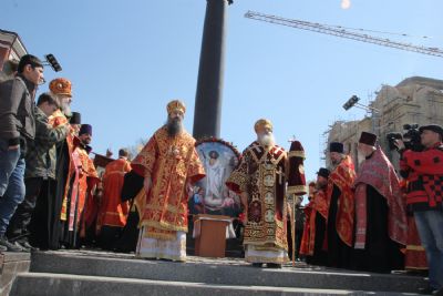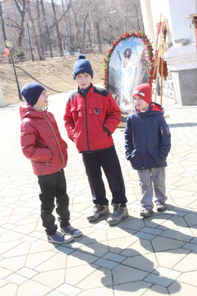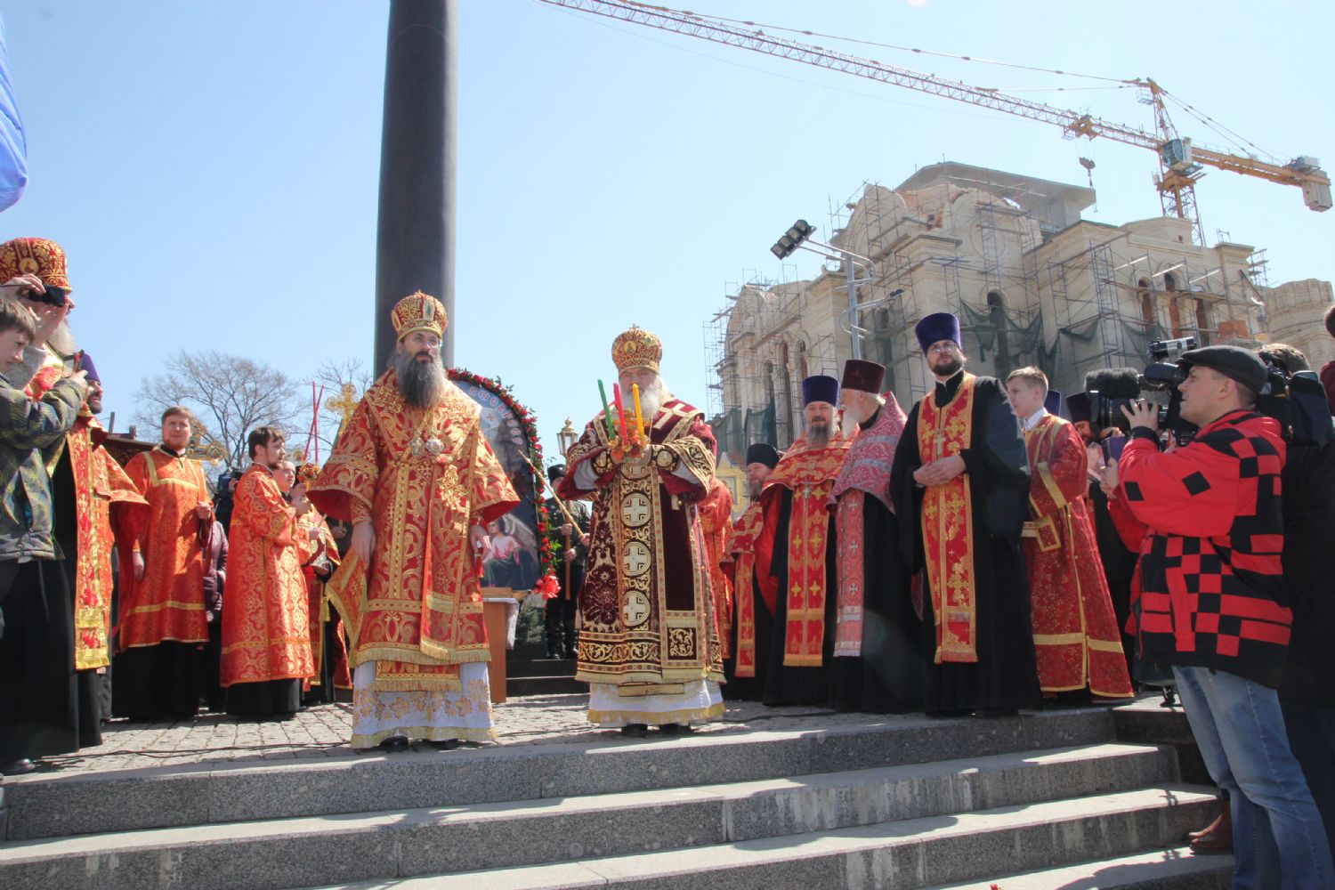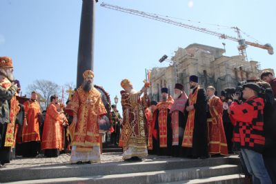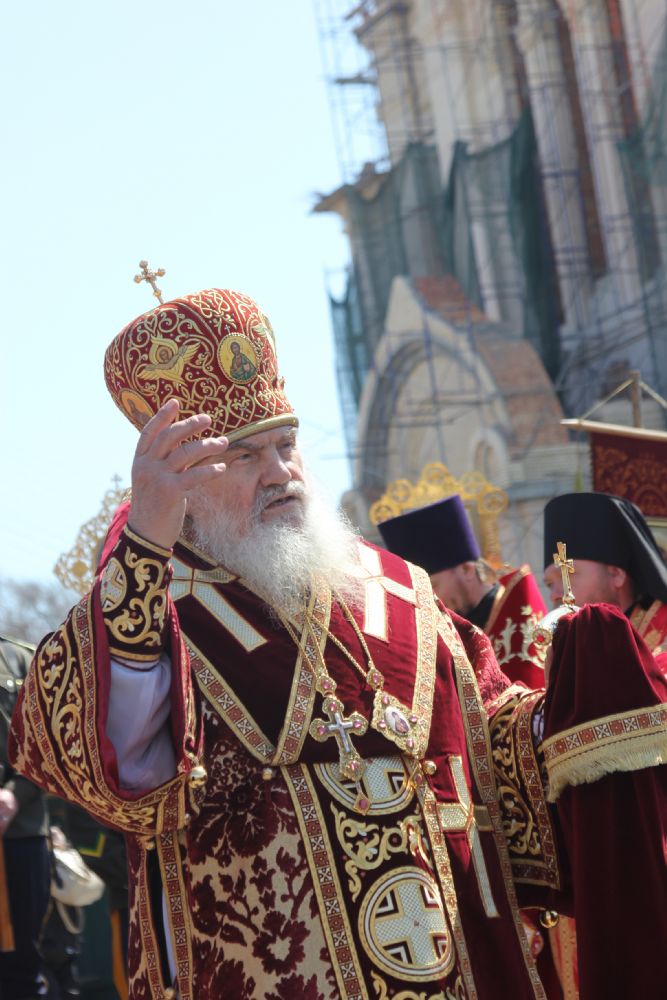 Митрополит Владивостокский и Приморский Вениамин встречал Пасхальный Крестный ход у стен строящегося Спасо-Преображенского собора. Перед иконой праздника Воскресения Христова, установленной на площадке стелы «Владивосток — город воинской славы», архиереи епархии совершили праздничный молебен, в сослужении которого принимали участие секретарь епархии протоиерей Игорь Талько; благочинный I округа, председатель Преображенского приходского совета протоиерей Димитрий Федорин; и клирик временного храма при приходе Преображенского собора иерей Александр Карапетян. Накануне, в Великую Субботу Страстной седмицы, совпавшую с праздником Благовещения Пресвятой Богородицы, на стройплощадку собора были доставлены первые купола.