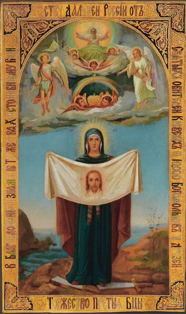 На свѣтлой недѣлѣ Высокопреосвященный Антоній, Митрополитъ С.-Петербургскій, посѣтилъ супруговъ Верховскихъ, любовался художественнымъ исполненіемъ образа и на вопросъ адмирала изъявилъ согласіе поставить этотъ образъ временно въ Казанскій соборъ для всенароднаго обозрѣнія. Къ сожалѣнію, этотъ планъ не удалось выполнить, такъ какъ со дня на день ожидалась оказія отдѣльной отсылки образа, обезпечивающая ого сохранность. На образѣ эмалированной вязью написано: «Торжество Пресвятыя Богородицы. Въ благословеніе и знаменіе торжества христолюбивому воинству Дальней Россіи отъ святыхъ обителей Кіевскихъ и 10,000 богомольцевъ и друзей». Образъ отправленъ адмираломъ Верховскимъ къ мѣсту назначенія. („Поч. Пис.“),