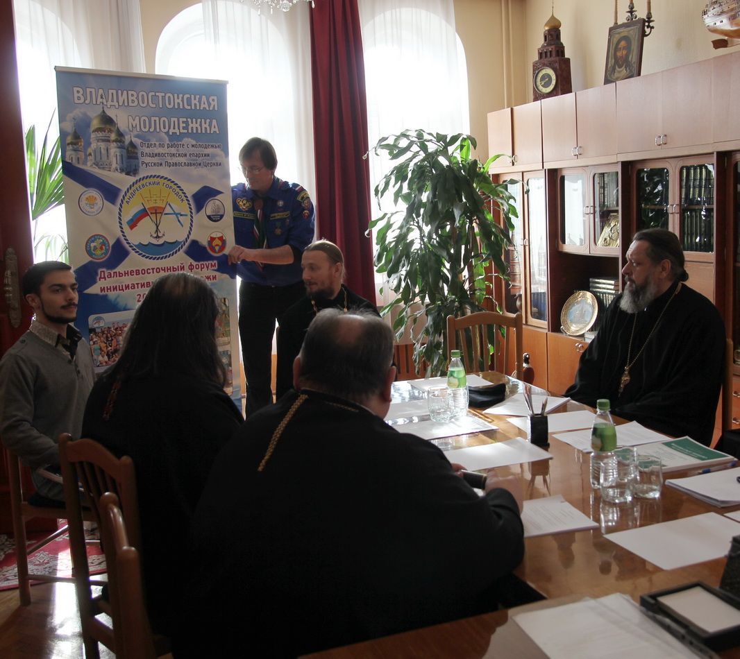 В его работе приняли участие члены Епархиального совета: викарий Владивостокской епархии епископ Уссурийский Иннокентий; секретарь Владивостокской епархии протоиерей Игорь Талько; руководитель отдела религиозного образования и катехизации протоиерей Ростилав Мороз; настоятель Никольского храма г. Владивостока протоиерей Василий Капитанюк.