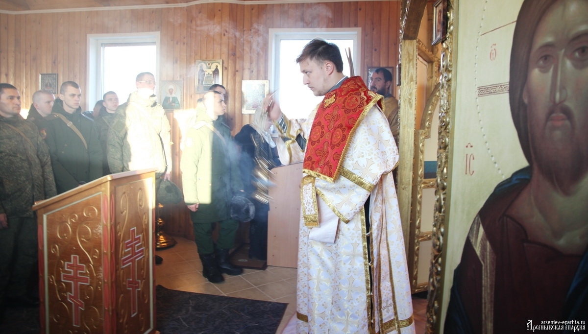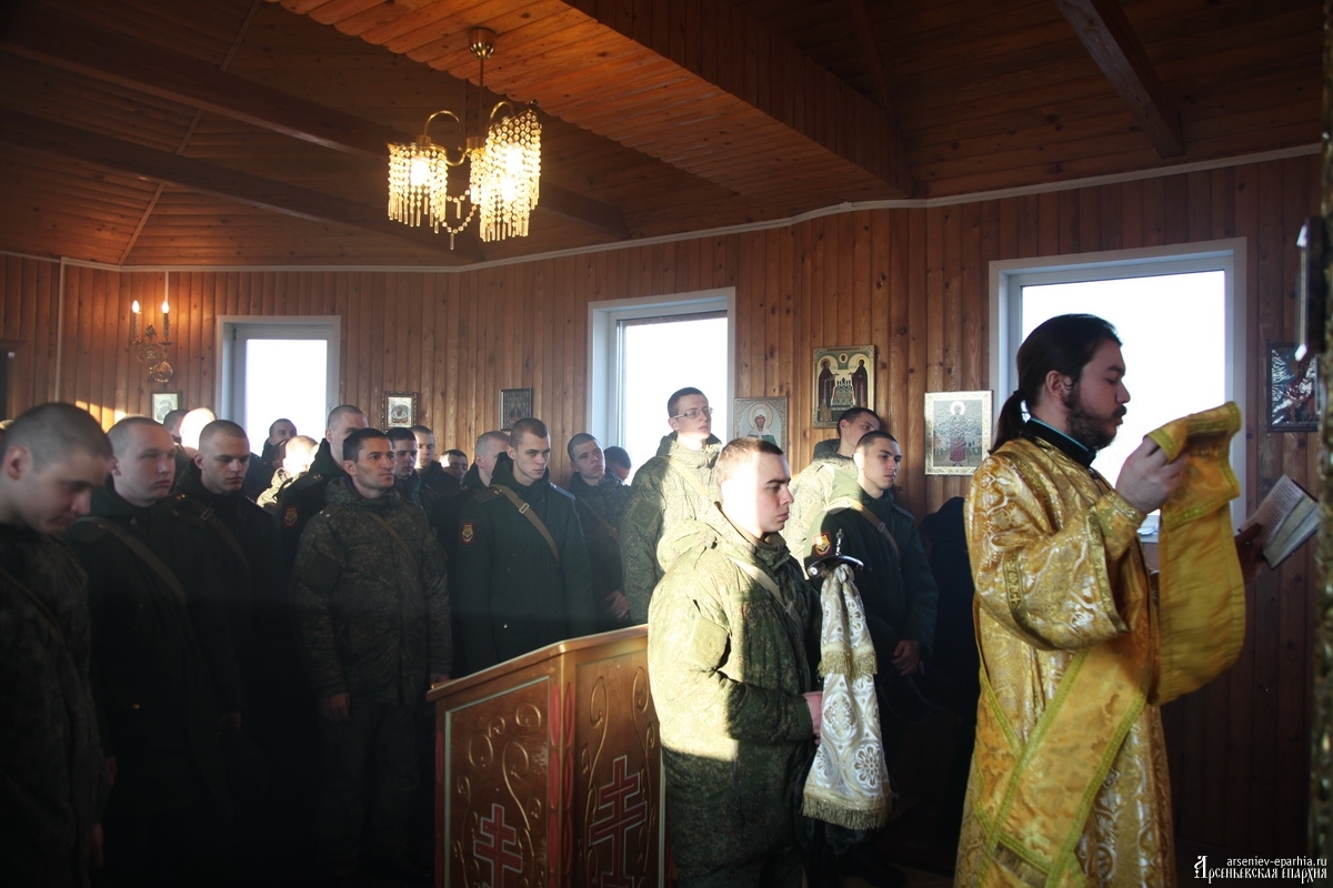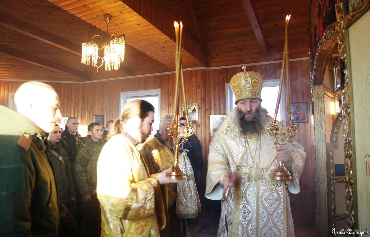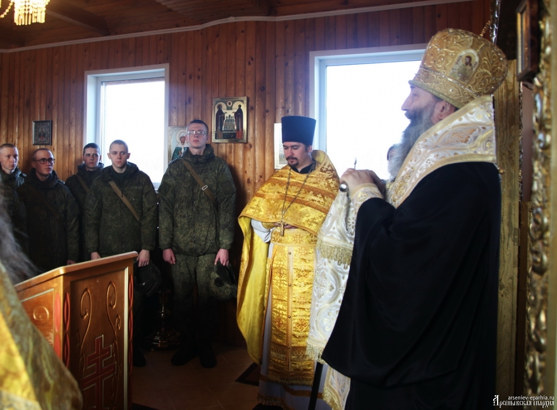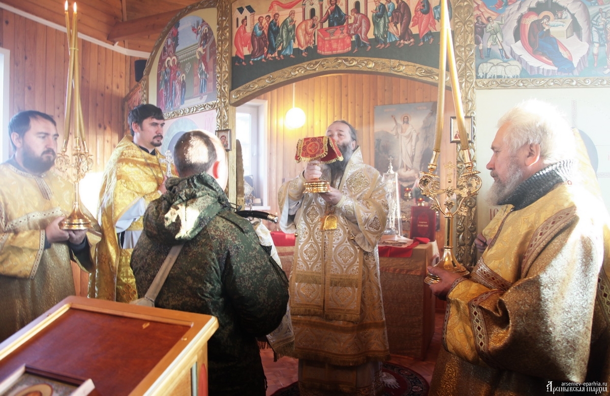На следующий день Владыка Гурий возглавил богослужение в воинской части №64845 села Старосысоевка в сослужении секретаря Арсеньевской епархии протоиерея Александра Сулема и настоятеля храма, полкового священника иерея Михаила Котенко, диакона Кирилла Зиновьева и диакона Николая Колесникова. За богослужением молились представители руководства части и около 50 военнослужащих.