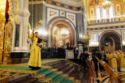 Богослужебные песнопения исполнили Патриарший хор Храма Христа Спасителя (регент И.Б. Толкачев) и братский хор Свято-Троицкой Сергиевой лавры (регент архимандрит Глеб (Кожевников)).