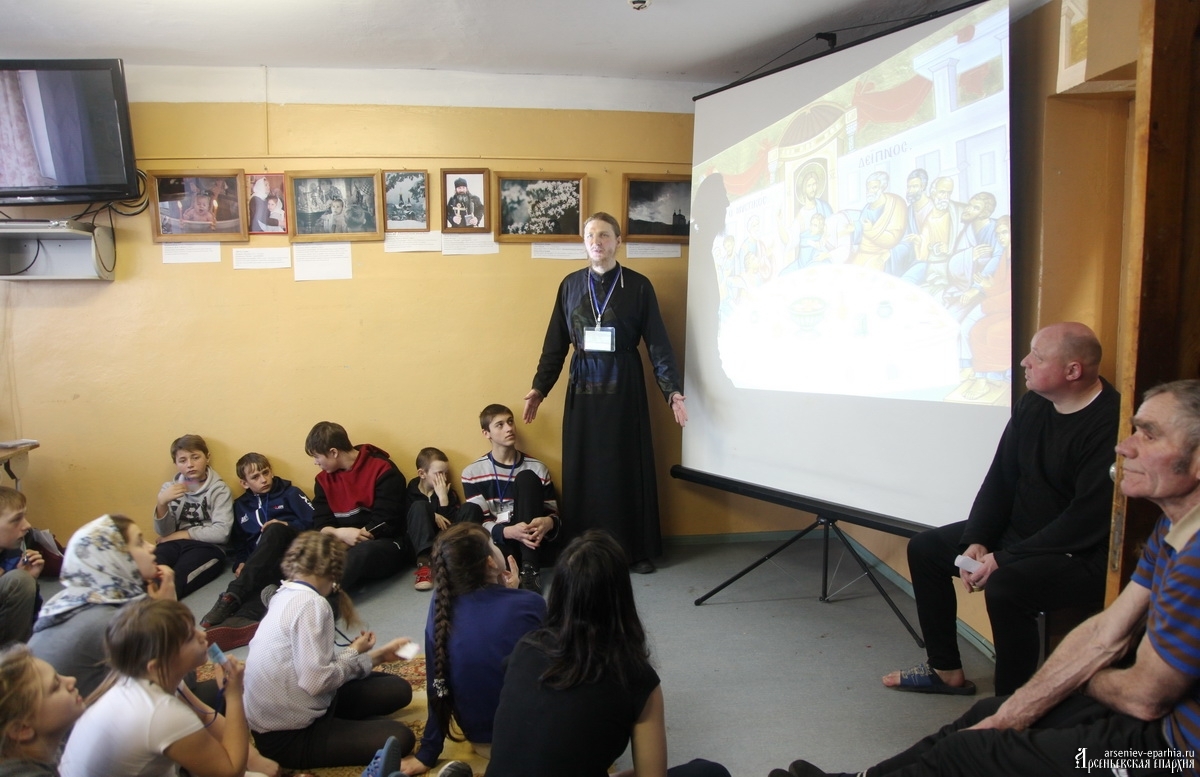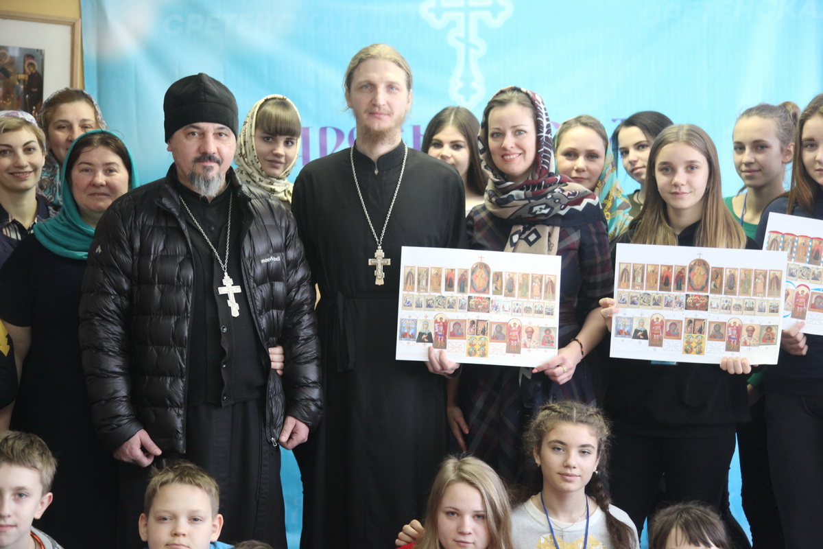 Так, утром 14 февраля к ребятам приехал клирик епархии иерей Димитрий Селивановский. О. Димитрий рассказал, кто такие пророки, святители, праотцы и преподобные, а также объяснил значение важнейших, двунадесятых церковных праздников. На слайдах священник показал ребятам шедевры древнерусской иконописи.