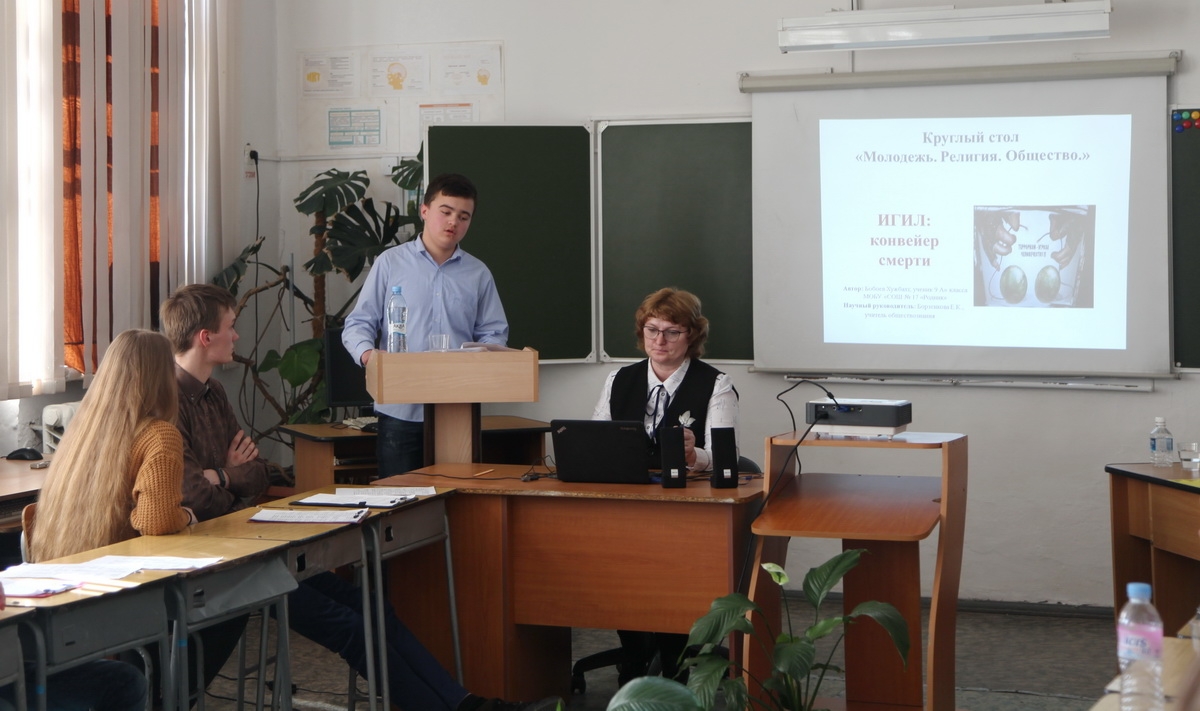 Тема круглого стола «Молодёжь. Религия. Общество», который прошёл 12 апреля 2019 г. на базе школы № 17 «Родник» по инициативе Борзенковой Елены Константиновны, директора учреждения. Данное мероприятие является дискуссионной площадкой учеников, педагогов, родителей, представителей традиционных конфессий России, работников Управлений образования и культуры, общественности.
