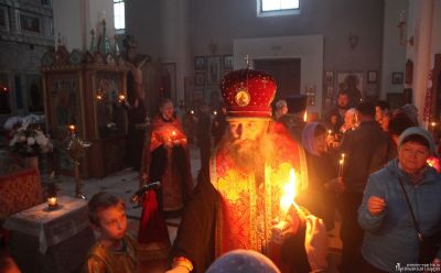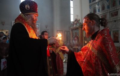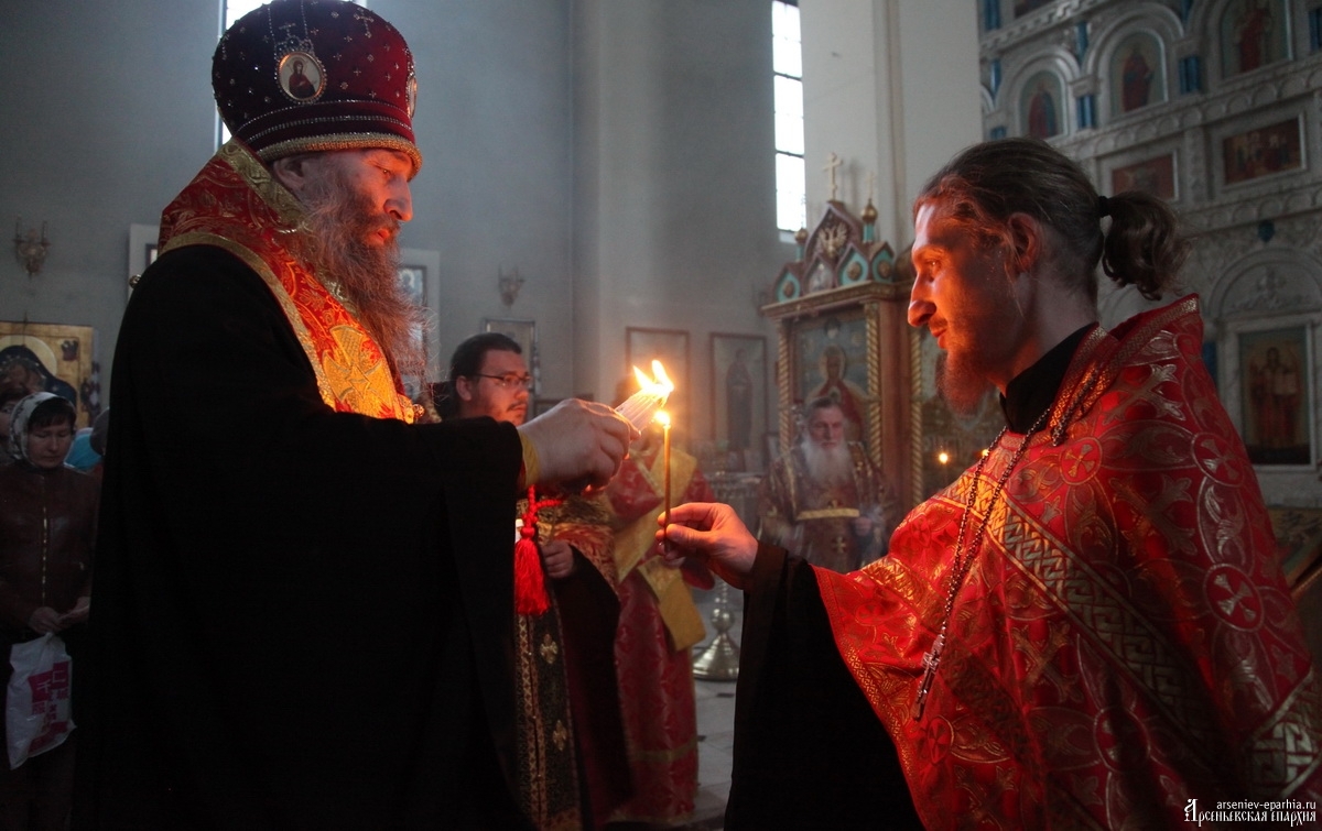 И вот, наконец, прибыла машина, и лампада с огнем была внесена в собор. Правящий архиерей, Преосвященнейший Гурий епископ Арсеньевский и Дальнегорский зажег от Благодатного огня сначала все лампады в алтаре, а затем и во всем храме.