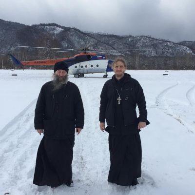 Владыка Гурий и иерей Димитрий Селивановский перед полётом в село Акзу. 2019 год