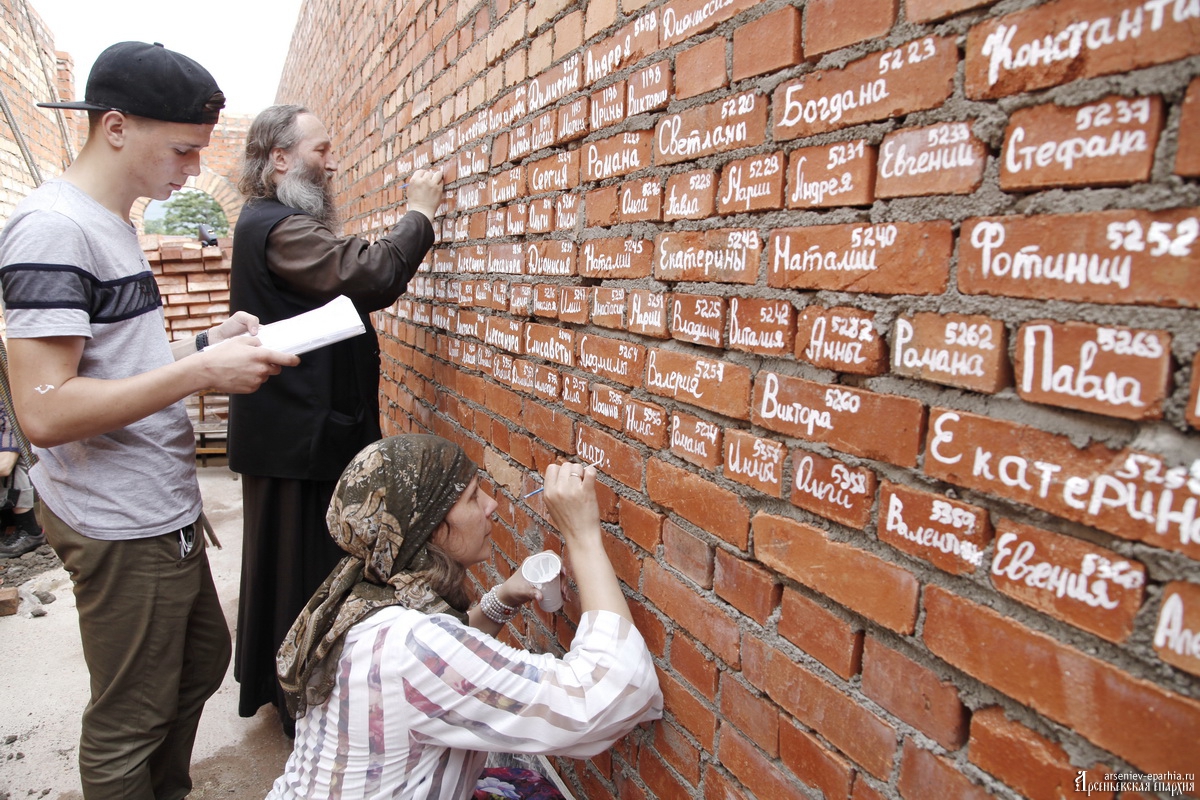 Жертвуя на именной кирпич, вы указываете имя конкретного человека, о котором будет возноситься церковная молитва и его имя будет написано на кирпичике, вложенном в стену храмового комплекса.