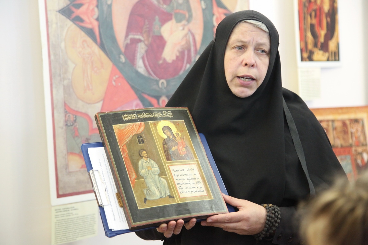 Юным посетителям выставки инокиня Мария показала икону «Прибавление ума», которой нужно молиться, чтобы достичь успеха в учебе и творчестве.