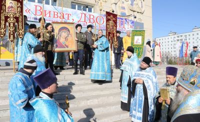Православные жители города прошли крестным ходом от Благовещенского собора к Дворцу культуры «Прогресс», где в эти дни проходит конкурс духовно-патриотической песни – Дальневосточная ярмарка хоров.