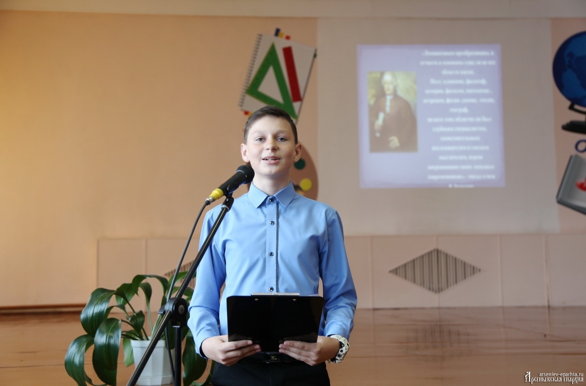 1 место – Волков Даниил, 13 лет, МОБУ СОШ № 10 г. Арсеньева – «Бесспорный гений – Ломоносов»
