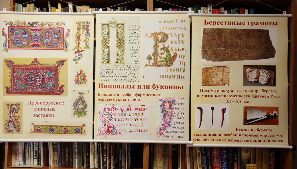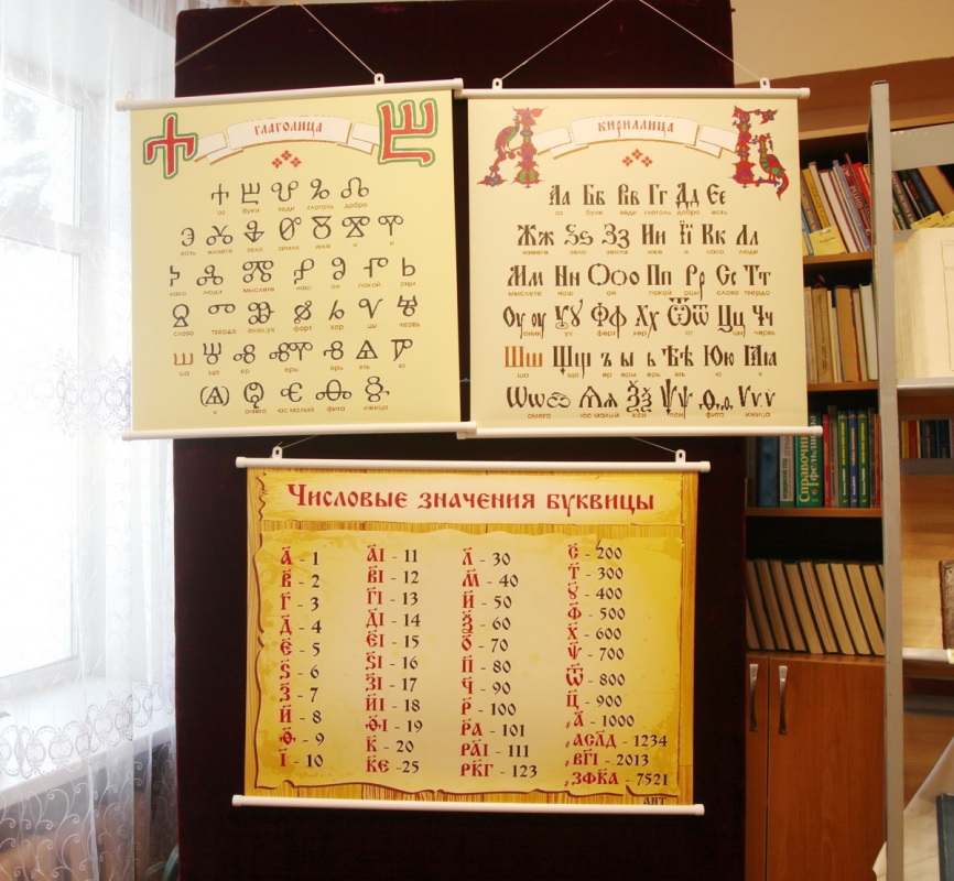 Первые берестяные записки, книги на церковнославянском языке, написанные вручную, первые печатные книги – всего на выставке представлено 43 книги и плаката. Все они – из коллекции Арсеньевской епархии.