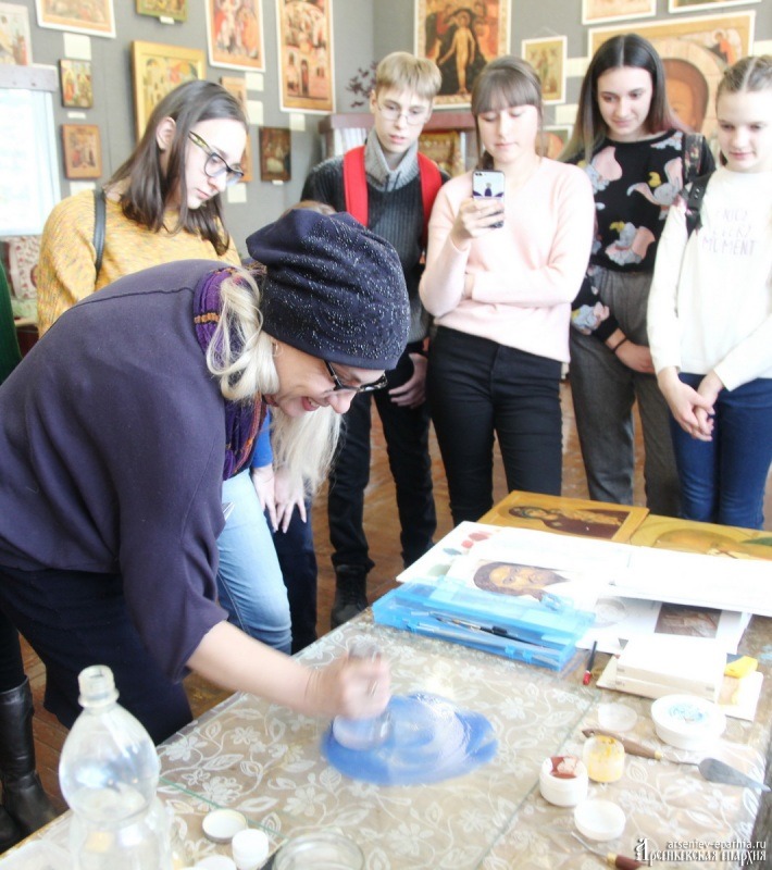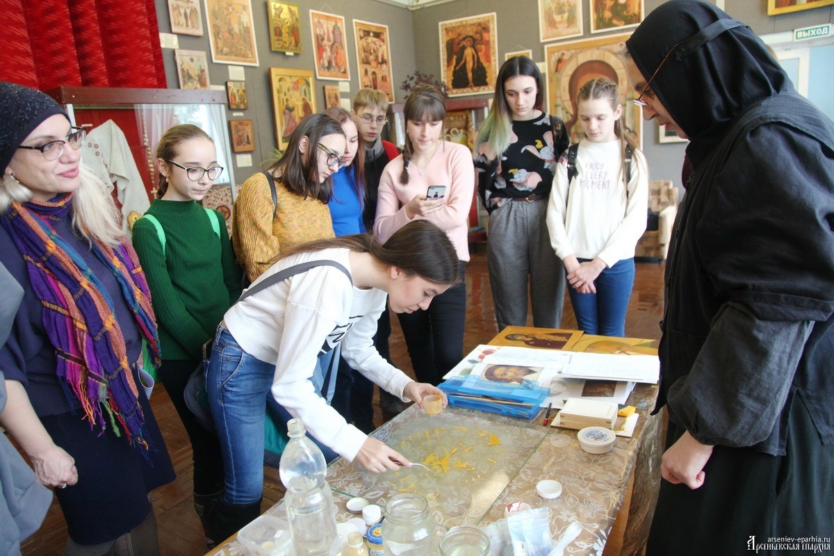 4 февраля в Музее истории г. Арсеньева состоялся мастер-класс по иконописи для учеников Детской Школы Искусств г. Арсеньева. Инокиня Дария (Муленкова), член Союза художников г. Москвы, иконописец Арсеньевской епархии, рассказала, что такое яичная темпера и как её изготовить, показала школьникам и взрослым, как растираются краски из натуральных пигментов, как наносятся краски на подготовленную доску. Ребята смогли попробовать свои силы в растирании красок и работы с ней, узнали много нового об иконописи и русской культуре.Яна Вадимовна Юбко, преподаватель художественного отделения ДШИ, рассказала нам о своих впечатлениях: “4 февраля нам с ребятами посчастливилось побывать на мастер-классе по иконописи! Татьяна Иосифовна встретила в музее нас как добрых друзей, и настроение уже перед началом мастер- класса было просто великолепное. А в выставочном зале мы с ребятами познакомились с замечательными добрыми людьми – Екатериной и инокиней Дарьей. Екатерина познакомила нас с удивительной выставкой, на которой были представлены настоящие иконы и копии.