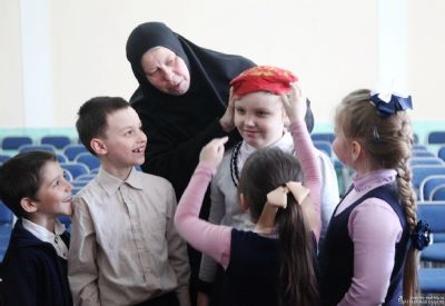 В начале работы выставки сотрудники Арсеньевской епархии провели для учащихся 1 и 4 классов необычную интерактивную экскурсию: по сюжету, к нам в XXI век попала крестьянка Василиса из села Бетлица Тульской губернии. И теперь Василиса рассказывает ребятам, как живут русские люди в XIX веке: во что верят, как одеваются, какие обычаи и традиции у них существуют.