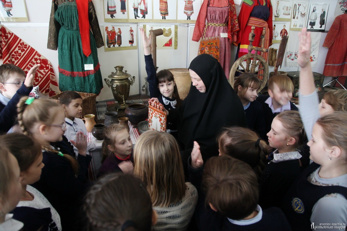 В начале работы выставки сотрудники Арсеньевской епархии провели для учащихся 1 и 4 классов необычную интерактивную экскурсию: по сюжету, к нам в XXI век попала крестьянка Василиса из села Бетлица Тульской губернии. И теперь Василиса рассказывает ребятам, как живут русские люди в XIX веке: во что верят, как одеваются, какие обычаи и традиции у них существуют.