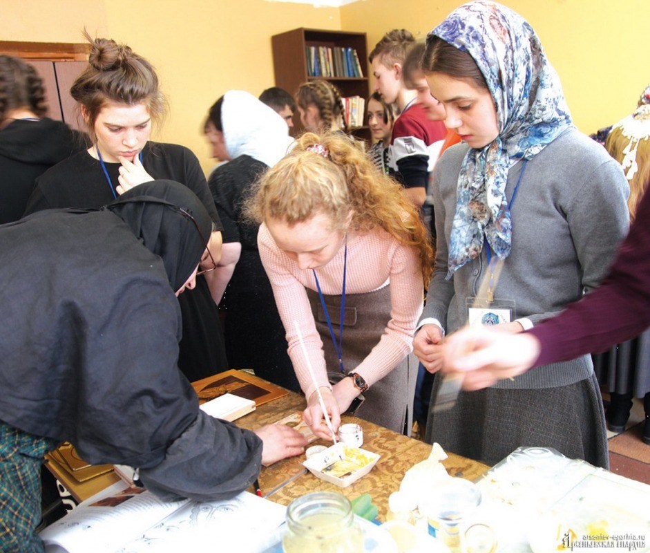 В этом году на лыжне было много образовательных мероприятий. Участники разделились на 4 образовательных направления. «Алтарникам» иерей Владимир Пыжиков рассказал об устройстве храма, показал священническое и диаконское облачение. «Звонари» отправились на колокольню кафедрального Благовещенского собора, где после рассказа звонаря Сергея попробовали звонить сами. Какой радостный колокольный звон огласил округу! А инокиня Дария (Муленкова) провела для участников «Сретенской лыжни» мастер-класс по иконописи.