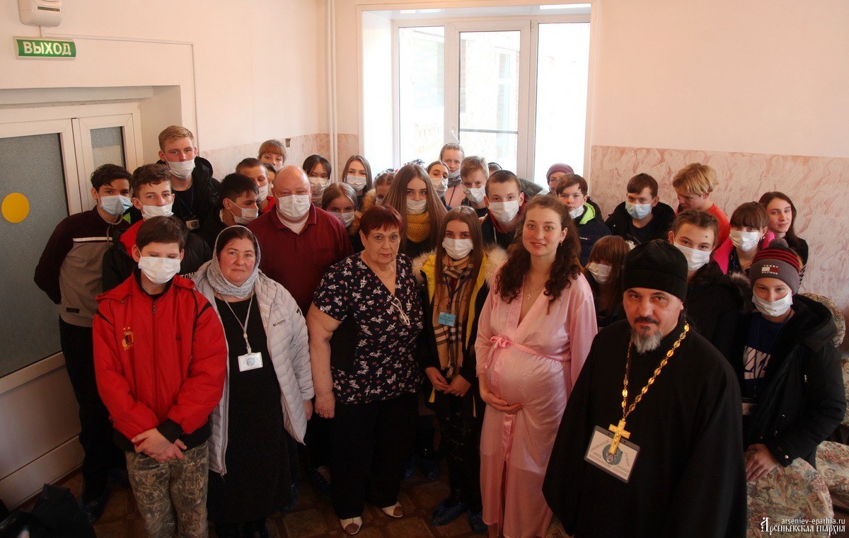 Часто эти проекты были посвящены защите жизни детей до рождения – эта тема почему-то особенно сильно волнует подростков. И вот в этом году, наконец, удалось воплотить проект в жизнь: утром 13 февраля участники Сретенской лыжни провели акцию “Дети против абортов” в роддоме г. Арсеньева. Ребята выступили перед будущими мамами с рассказом о том, что такое аборт, рассказали о своих семьях. Дочери иерея Владимира Абрамова Татьяна и Лидия рассказали о том, что даёт ребёнку большая семья. Девушки знают об этом не понаслышке: в семье отца Владимира 12 детей.