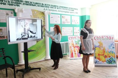 Библиотека арсеньевской гимназии №7 еще пахнет свежей краской. Здесь всё –в пушкинском духе: на стенах цитаты из стихотворений величайшего русского поэта, магнитные пазлы напоминают о сюжетах пушкинских сказок, а в скульптурной арке виднеется Михайловское…