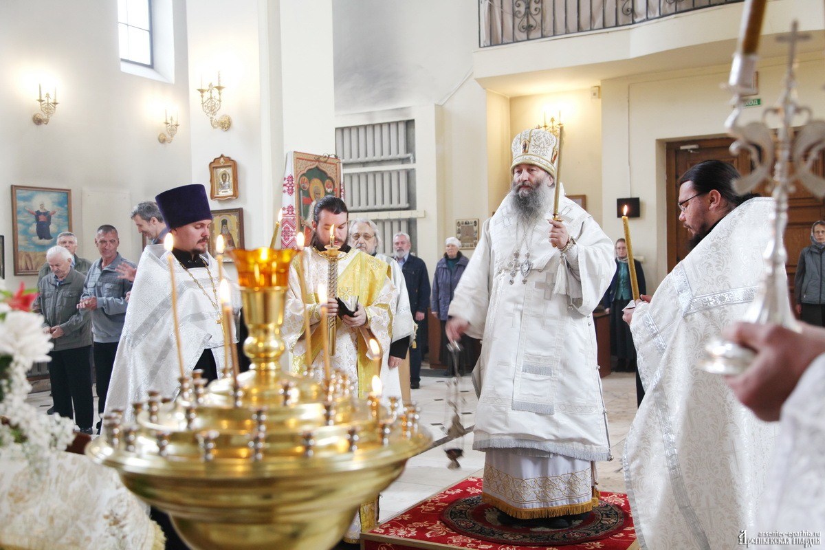 В конце богослужения Владыка рассказал о празднике: «Дорогие братья и сестры, отец Варсонофий, поздравляю вас с престольным праздником Вознесения Господня. Закончились дивные, солнечно духовные Пасхальные дни. Вчера было Отдание Пасхи. 40 дней Святая Церковь, и мы вместе с ней, праздновали эти радостные пасхальные дни. В завершении этого, в четверг, мы празднуем праздник Вознесения Господня. День, когда Господь завершил все дела на земле, попрощался с апостолами, дал им последнее свое завещание и вознёсся на небеса. Господь вместе с человеческой плотью вознёсся на Небеса, и сел одесную Бога Отца. Он открыл нам райские двери, чтобы мы могли войти на небеса и вечно радоваться вместе с Ангелами, с Божьей Матерью, со святыми в Царствии Небесном.